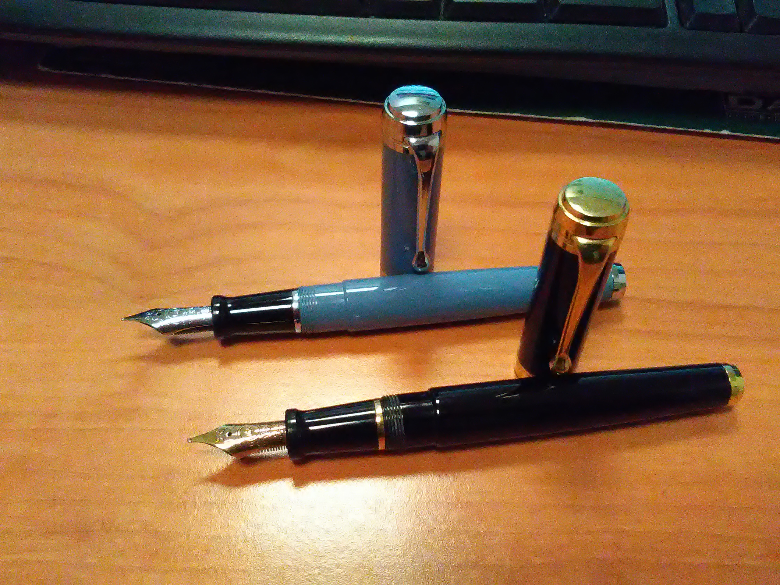 Pineider Egosphere, pennino M, con vecchio Pelikan Blu-nero ferrogallico e Sheaffer Imperial, pennino stub, con Aurora blu.