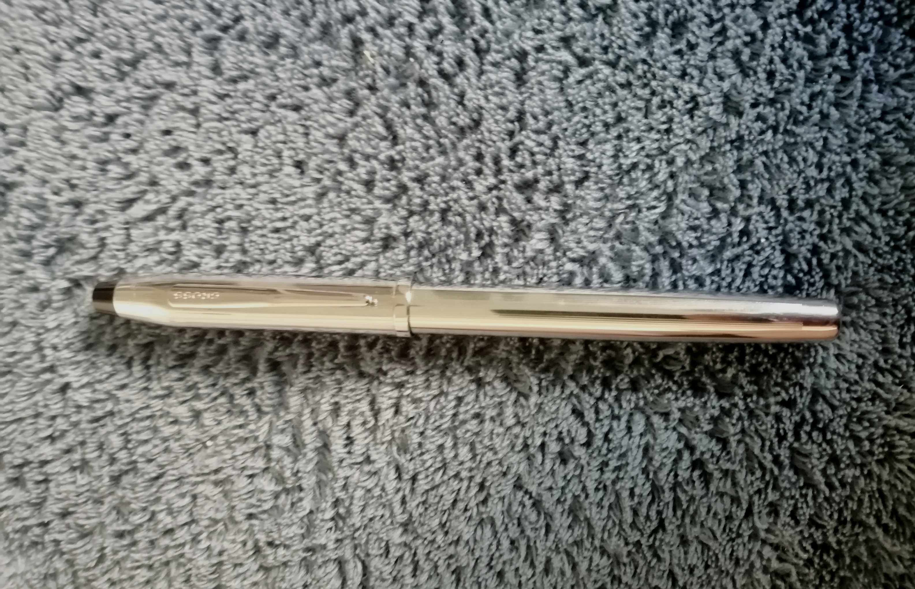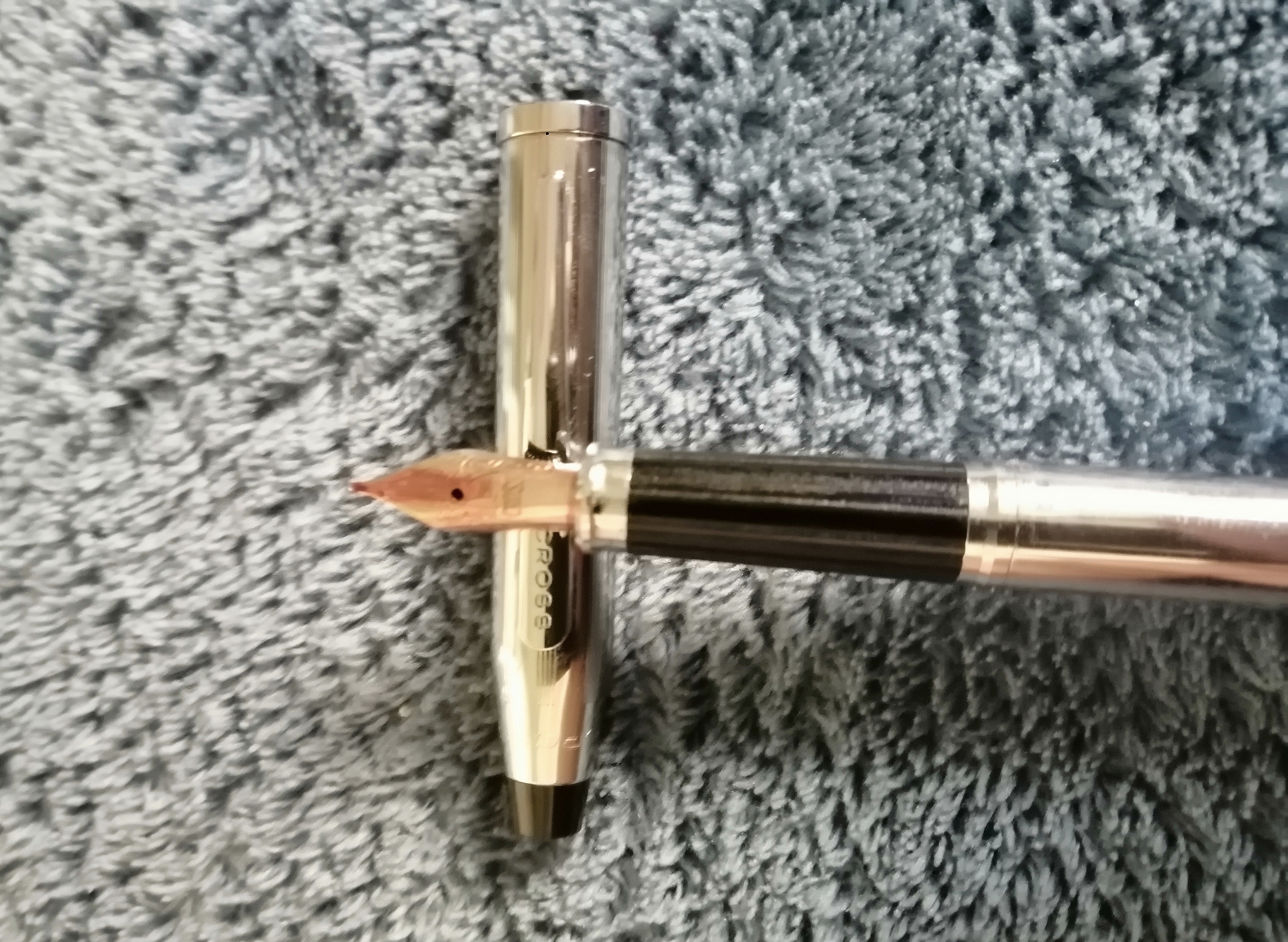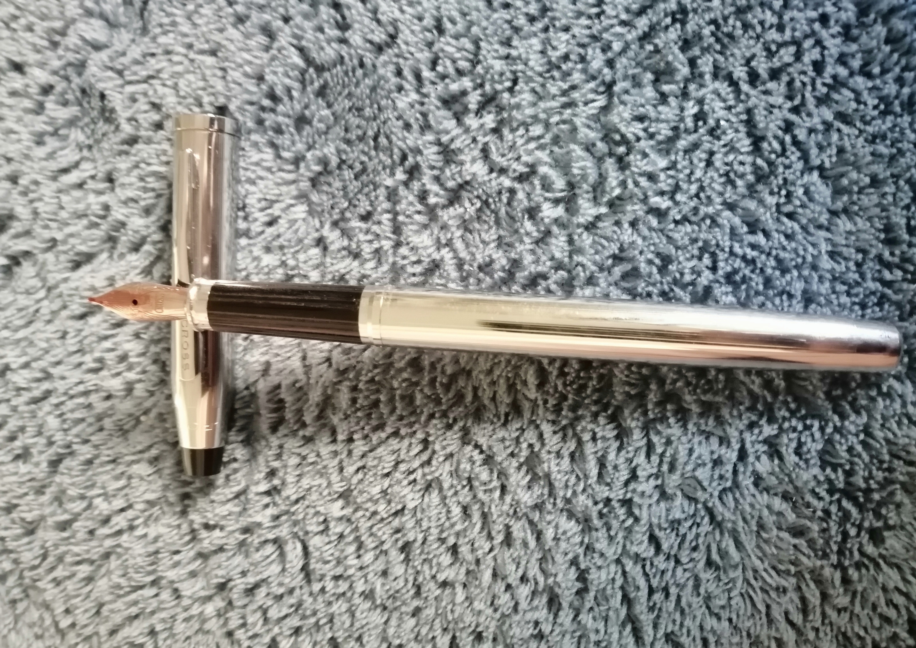 Linea inconfondibile Cross, quella delle celebri biro e matite Century, stilografica onesta, elegante nella livrea tutta cromata, priva di pesanti orpelli estetici e, alla fine è ciò che conta, scrive bene.