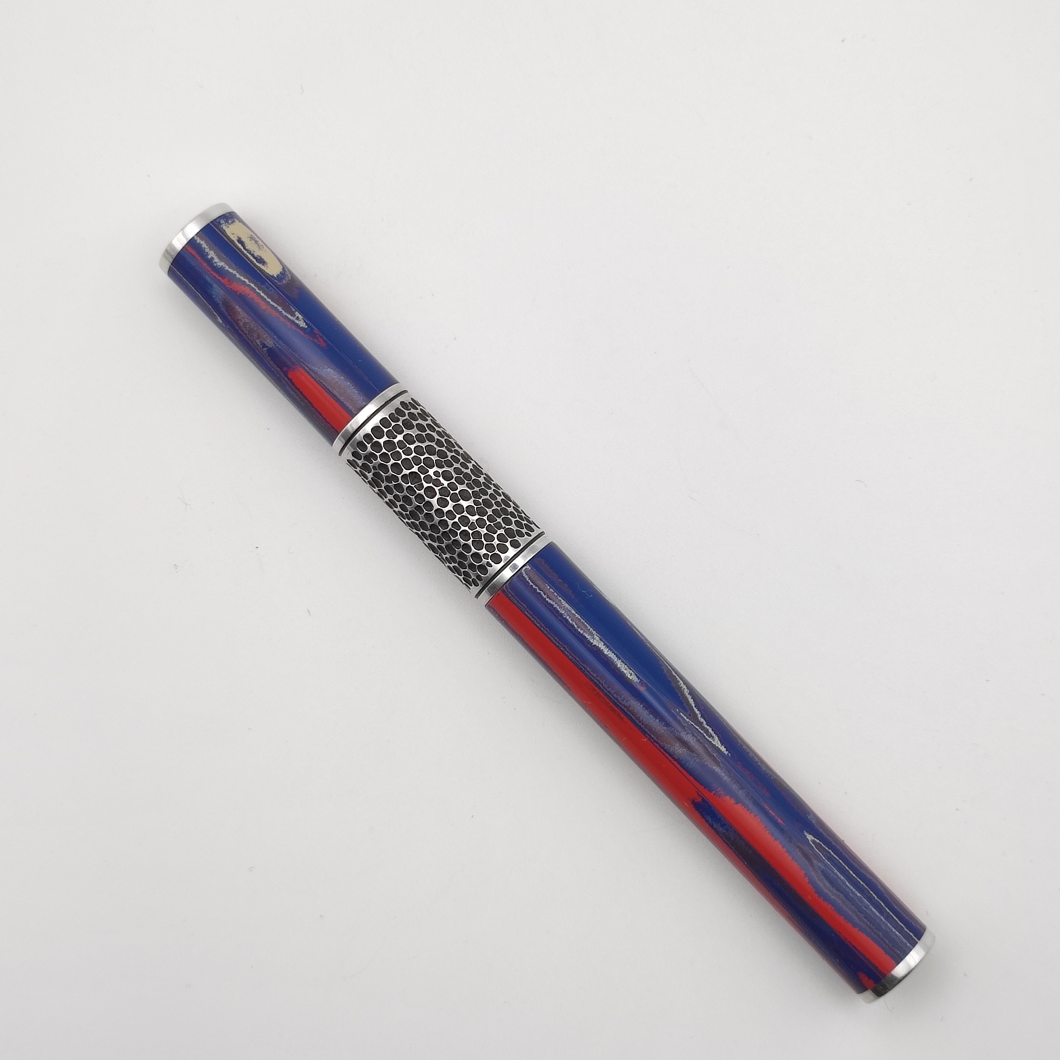 Il suo nome è Gavia, ha una forma cilindrica su tutta la lunghezza di13mm di diametro; sull'impugnatura in alluminio ho realizzato questo effetto stile martellato annerendo poi le cavità. Il cappuccio chiude solo il pennino Bock no. 6. È realizzata in ebanite colorata mottled. Anche i terminali sono in alluminio.