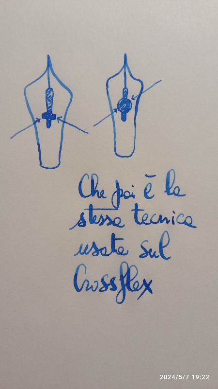 Mi sembra anche abbastanza probabile che rispetto semplicemente ad allungare il taglio tra i rebbi (che funziona ma mica troppo, vedi con quale fatica si flette il Kanwrite flex), e in mancanza di materiali più idonei a flettersi come nei pennini vintage, allungarlo e allargarlo contemporaneamente possa rendere i rebbi "più liberi" di allargarsi, rendendo la struttura complessiva del pennino nella zona dei rebbi meno rigida. E' una ipotesi che le prove viste sembrerebbero confermare, anche se empiricamente.