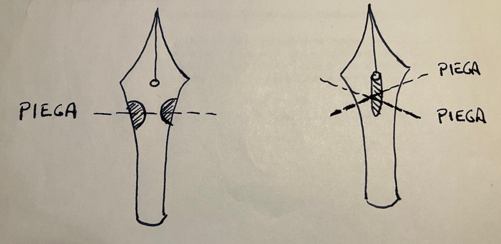 In quel punto quindi il pennino si piega in modo perpendicolare al taglio tra i rebbi. Questo dà morbidezza al pennino (elasticità) ma non flessibilità.