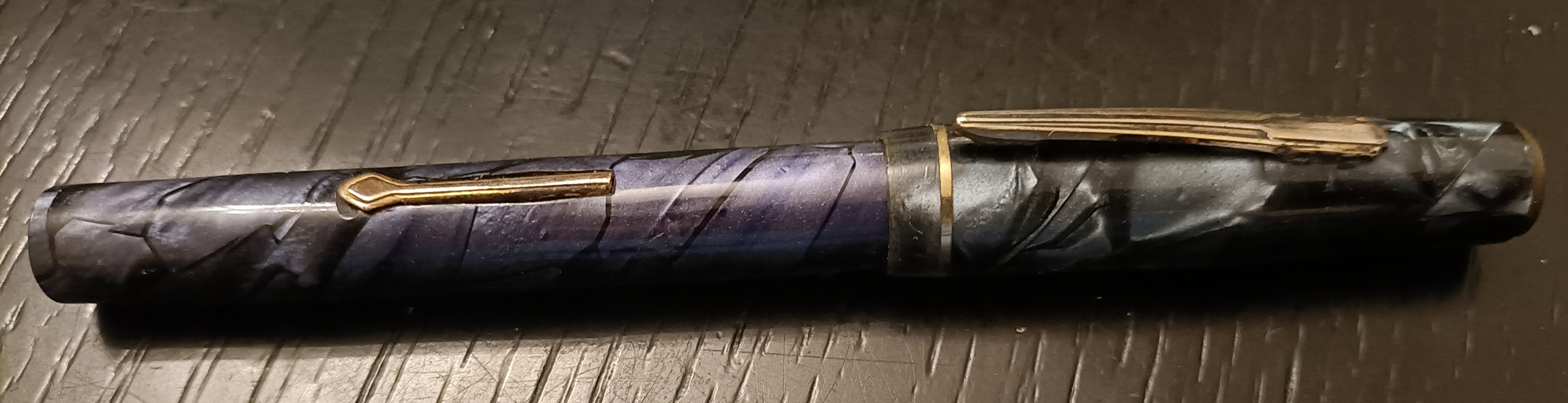 Ho scoperto però che non tutti gli esemplari riflettono queste caratteristiche quando ho messo le mani su questo esemplare, caratterizzato da un design simile ad altre penne della marca, ma con finiture e celluloide molto particolari. Si tratta, come dicevo, di una penna piuttosto semplice, con caricamento a levetta e pennino warranted, cosa piuttosto comune, dato che ho altre Wyvern con pennino simile. Però la celluloide è decisamente più ambiziosa della media, e io la trovo molto bella. Spicca la raffinata veretta traforata in stile art decò Alcune cifre, senza pretese di completezza
