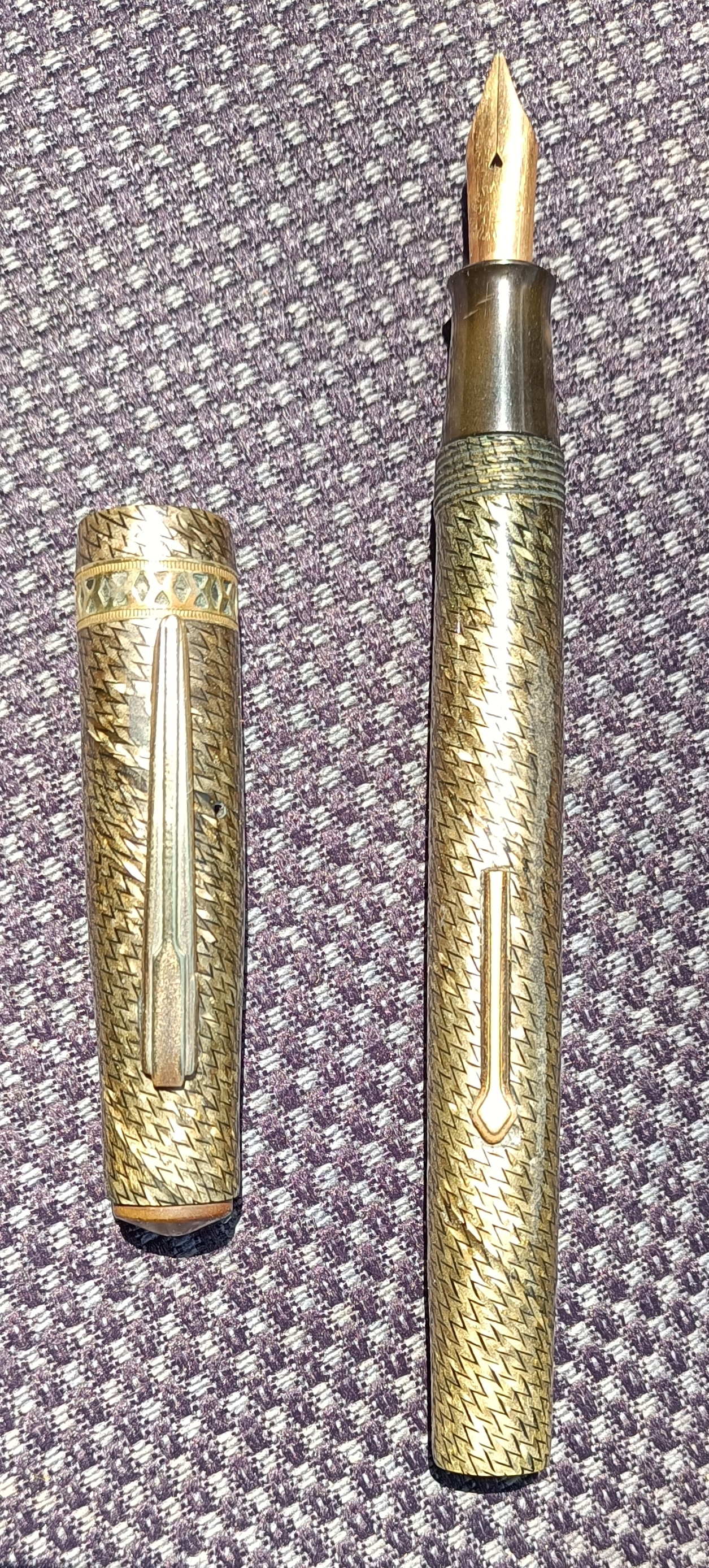 Ho scoperto però che non tutti gli esemplari riflettono queste caratteristiche quando ho messo le mani su questo esemplare, caratterizzato da un design simile ad altre penne della marca, ma con finiture e celluloide molto particolari. Si tratta, come dicevo, di una penna piuttosto semplice, con caricamento a levetta e pennino warranted, cosa piuttosto comune, dato che ho altre Wyvern con pennino simile. Però la celluloide è decisamente più ambiziosa della media, e io la trovo molto bella. Spicca la raffinata veretta traforata in stile art decò Alcune cifre, senza pretese di completezza