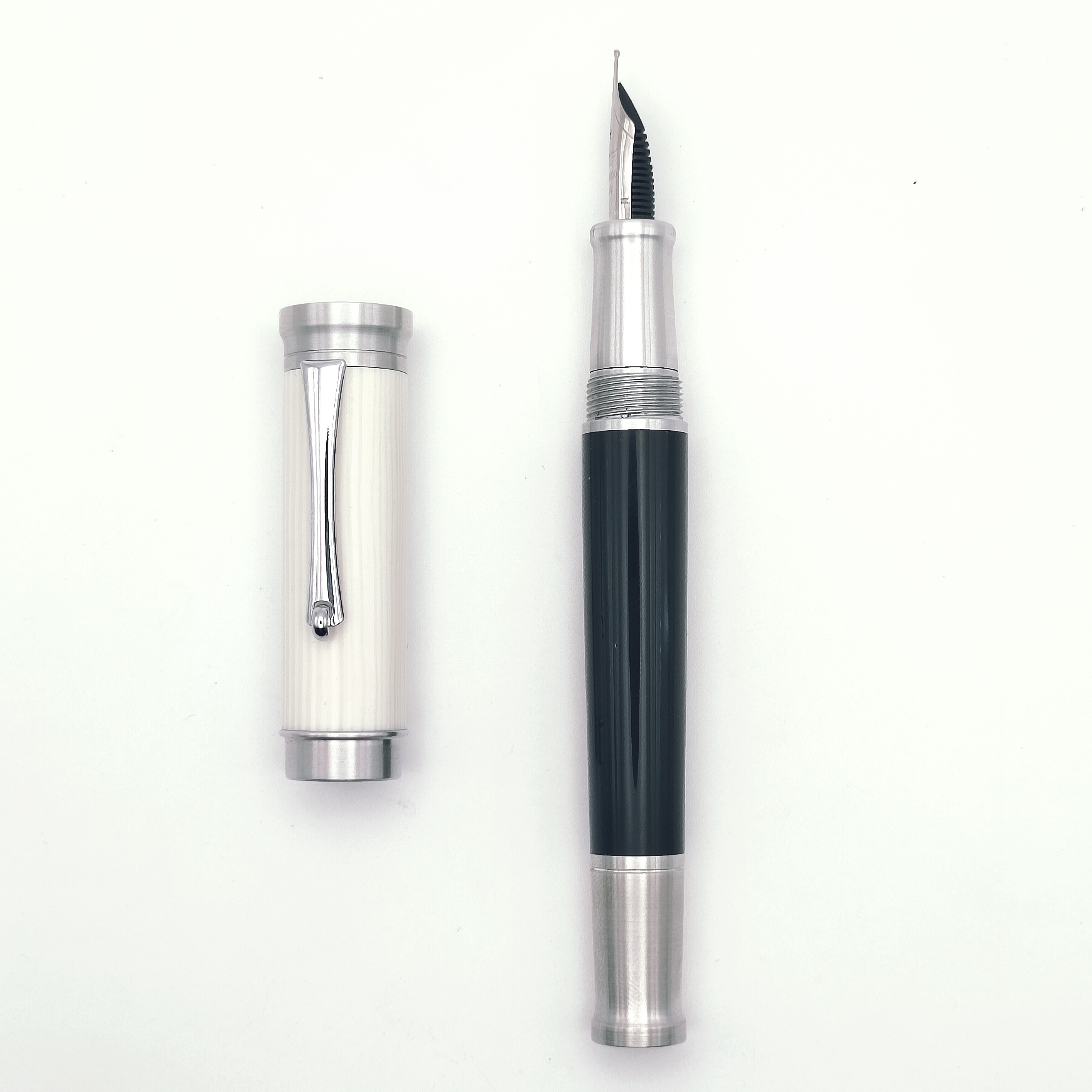 Volevo presentarvi la mia ultima realizzazione: ispirata ad un modello writing edition della Montblanc ho realizzato questa stilografica in galatite bianca e acrilico perlaceo blu. Tutte le parti metalliche in alluminio satinato e pennino Jowo no.6 con converter. Misura142mm da chiusa, il diametro del cappuccio è di 16mm, quello del corpo di 14. Pesa 38g.