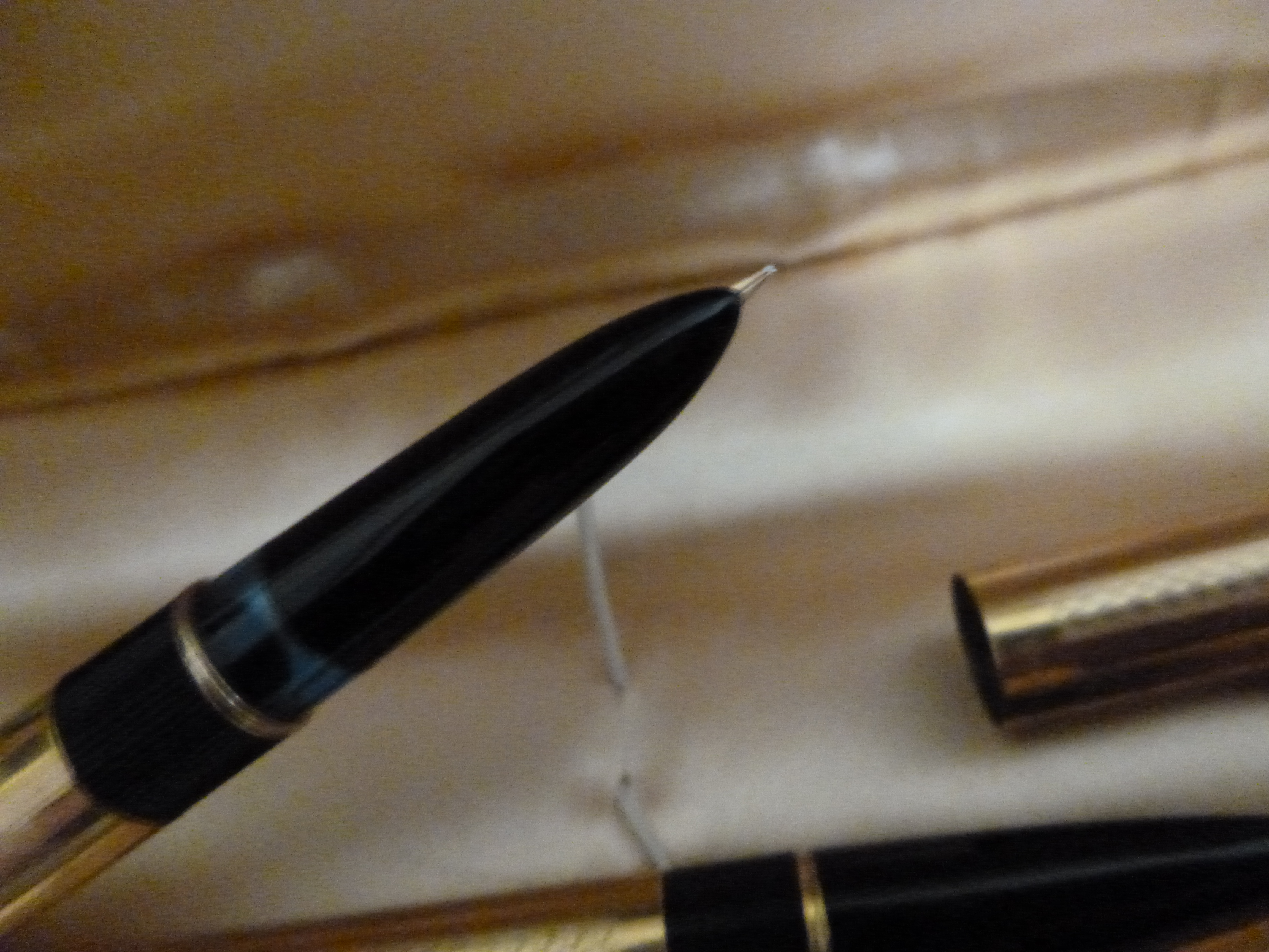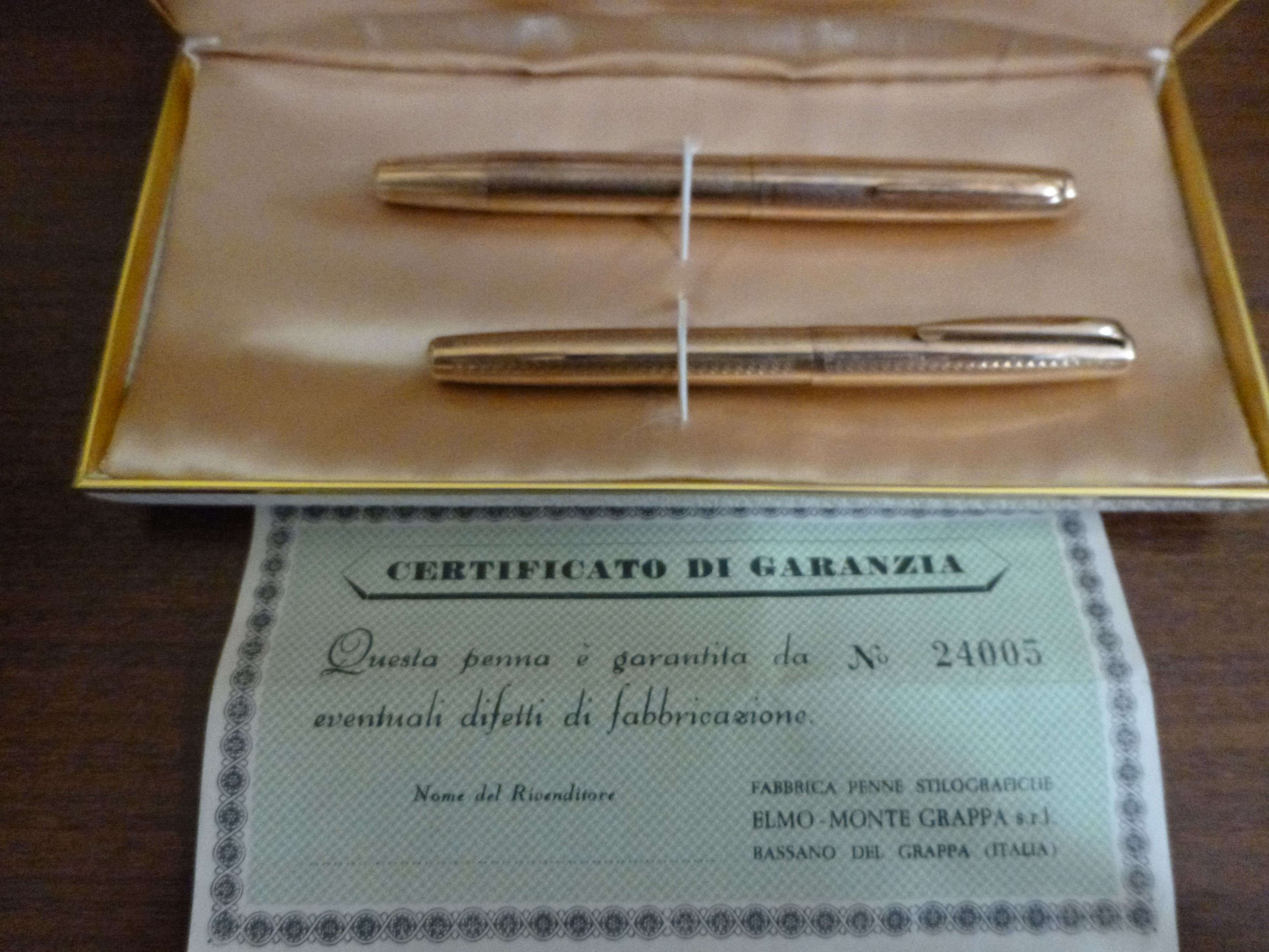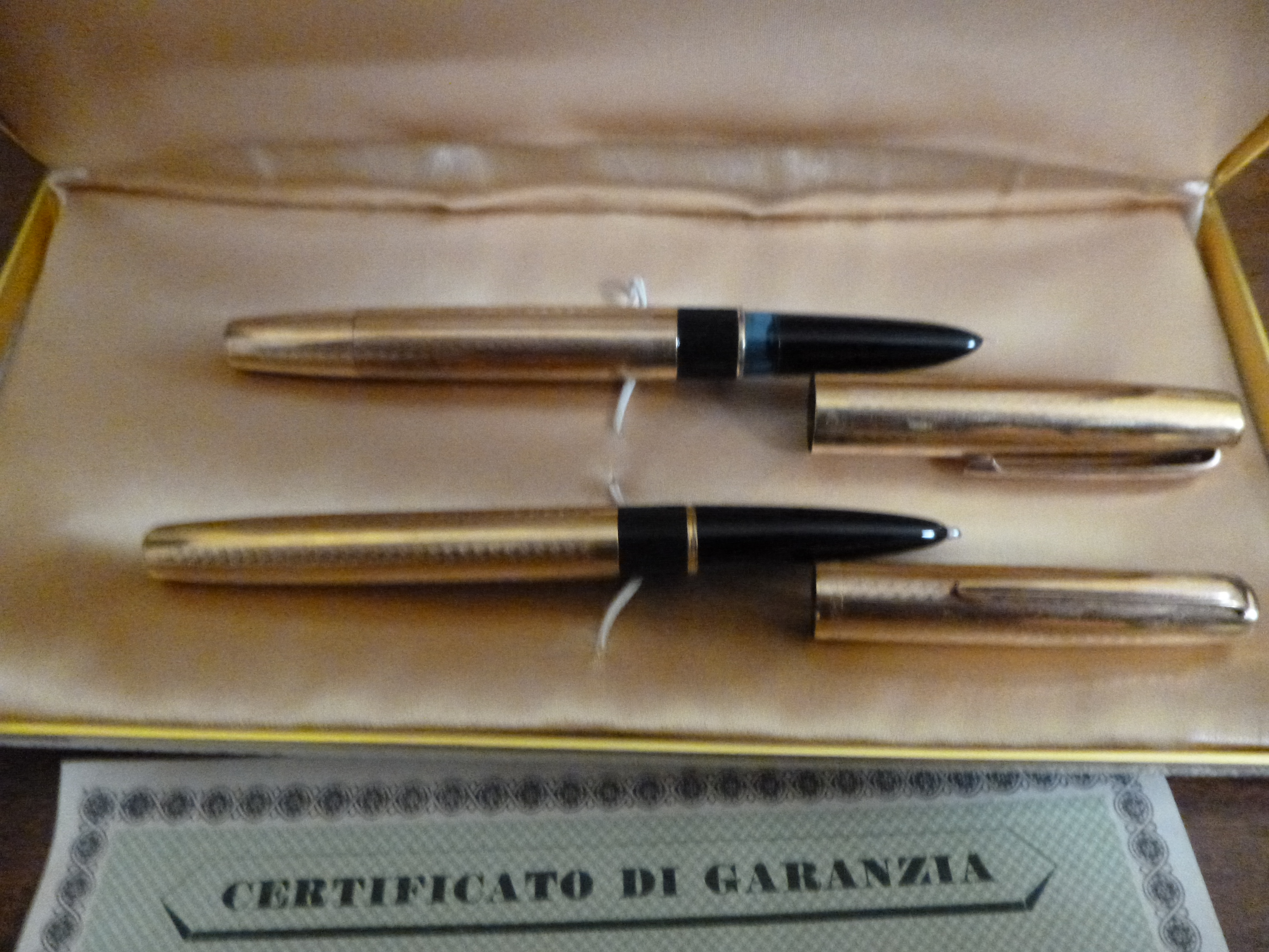 Buongiorno a tutti, come anticipato nella mia presentazione, nei gg scorsi, mettendo un po’ di ordine tra le mie penne ho ritrovato questa confezione di Montegrappa che contiene una stilografica ed una penna a sfera. L’astuccio presenta le caratteristiche tipiche degli oggetti di pregio, mentre sia la stilografica che la sfera danno l’impressione all’occhio inesperto del sottoscritto, nonostante siano placcate-oro, di un prodotto molto basico, e quasi dozzinale. Io ho stimato in una sessantina di anni la loro età, ma la stima è stata fatta senza solide basi, e basata su quei pochissimi ricordi che ancora ho. (Sono un “diversamente giovane”). Di certo so che sono assolutamente nuove, non le ho mai utilizzate neppure una volta, e ricordo di averle tra le mie penne praticamente da sempre. Non essendoci alcuna referenza circa il modello chiedevo se qualcuno poteva aiutarmi ad identificarle. Ho provato a fare ricerche, ma con risultati nulli, per cui ho pensato di rivolgermi al Forum. Quello che sto cercando di capire è se valga la pena conservarle, oppure….Grazie a tutti coloro che vorranno rispondermi. Una valutazione economica non è assolutamente indispensabile ma aiuterebbe solo a capire se, non avendo alcun valore affettivo (a differenza di altre), possa avere un senso continuare a conservarle. Grazie a tutti e buona giornata.