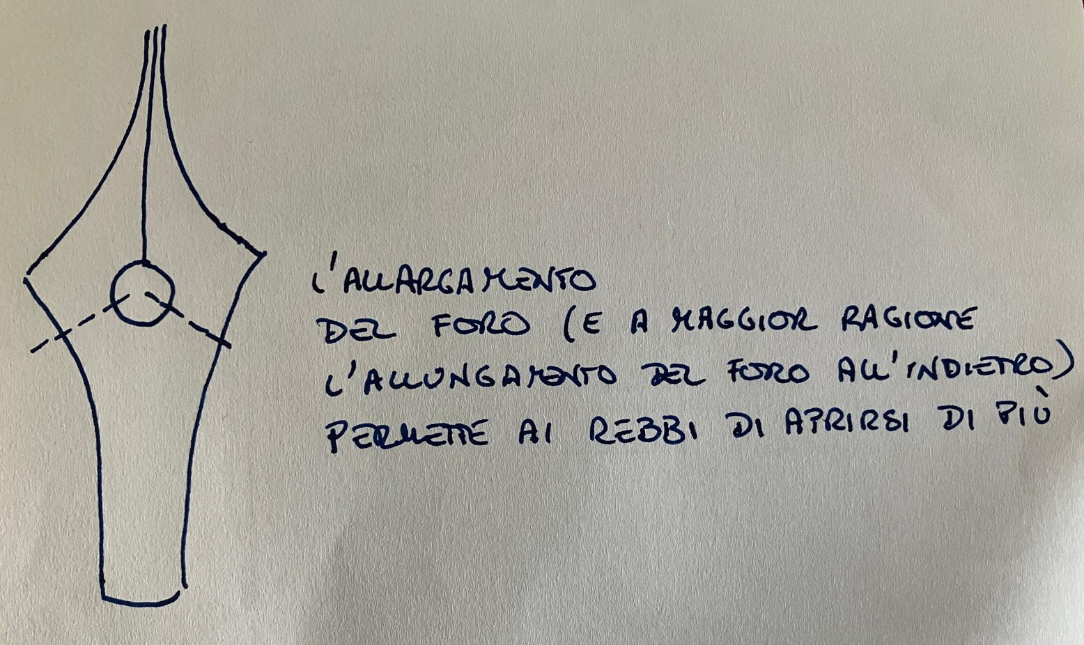 Bobje, super moderator di FPN, ad un certo punto, mostra questo suo disegno, nel quale cerca di spiegare come cambi la posizione dello "splay pivot" (fulcro di strombatura) quando si va a togliere materiale dall'interno del pennino o dall'esterno.