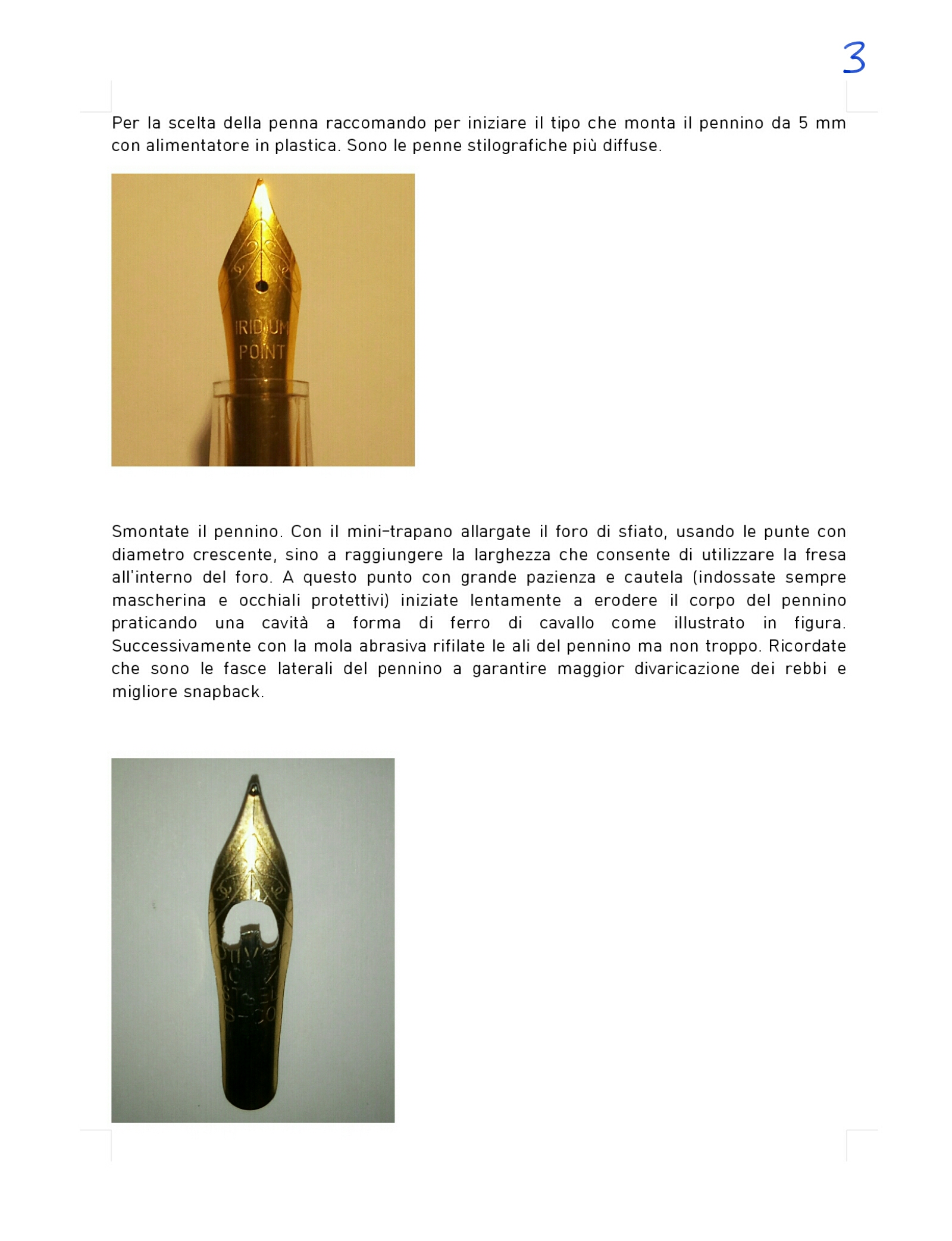 A mio avviso la causa è questa: mentre nel flessibile vintage costruito con una lega metallica molto elastica era solo la parte superiore (la punta) del pennino a flettersi, nel pennino in acciaio (meno elastico quindi) per ottenere una variazione di tratto apprezzabile è necessario spostare il momento elastico dalla parte superiore del pennino (la punta) alla parte inferiore (la base). Questo comporta un maggior distacco del corpo del pennino dall'alimentatore. A questo punto il flusso d'inchiostro è meno soggetto alla capillarità e sono prevalenti invece gravità e tensione di superficie del fluido. Praticamente il pennino agisce in maniera analoga ad un pennino da intinzione. Non è quindi il maggior diametro del foro di sfiato che aumenta lo scambio d'aria, ma il maggior diametro del foro di sfiato come pure altri interventi che producono un maggior distaccamento del corpo del pennino dall'alimentatore.
