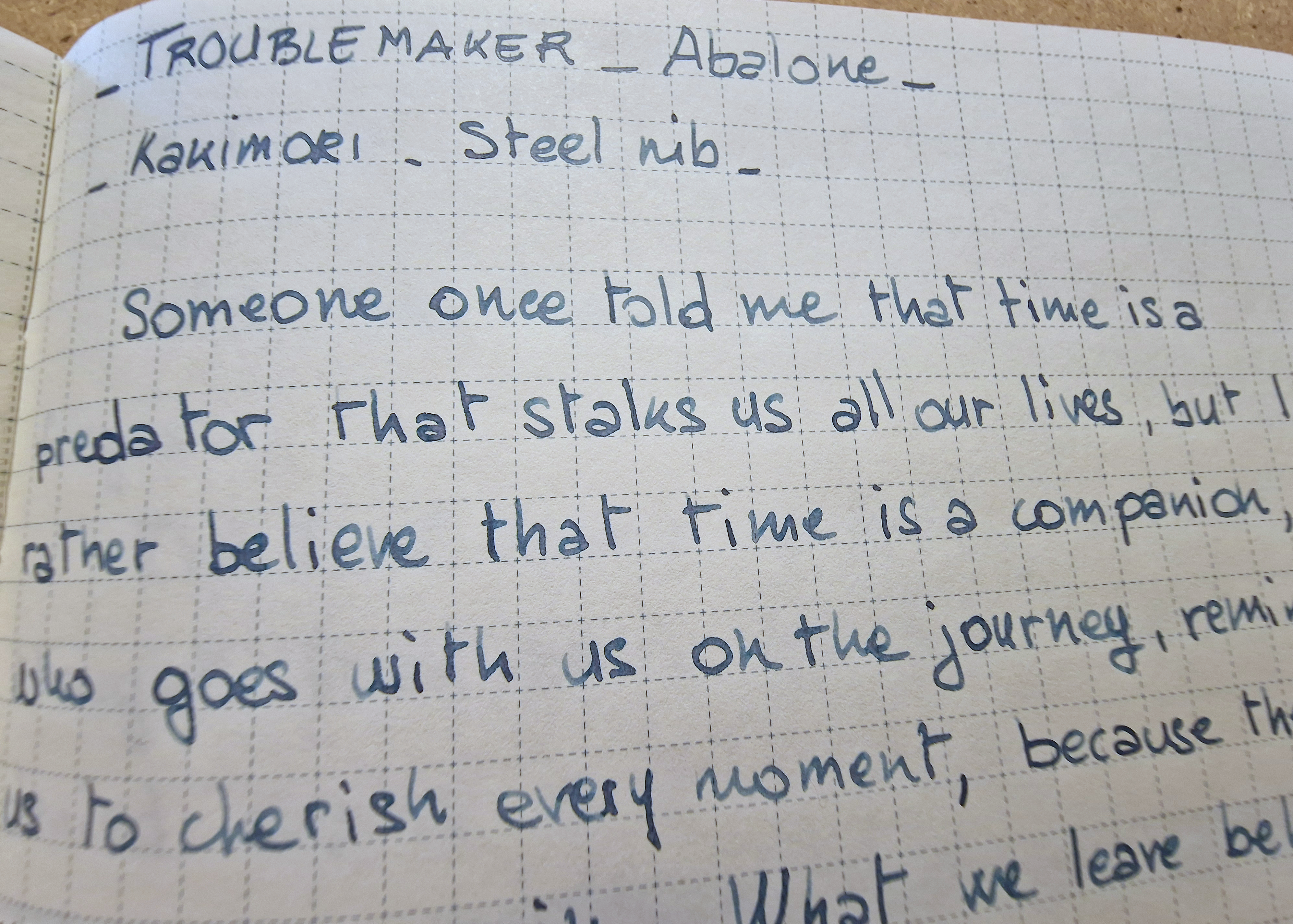 E' molto piacevole alla vista, non molto lubrificato. Con il pennino Kakimori fatica un poco a scendere, a causa, probabilmente, dell'alta percentuale di acqua e di poca tinta.