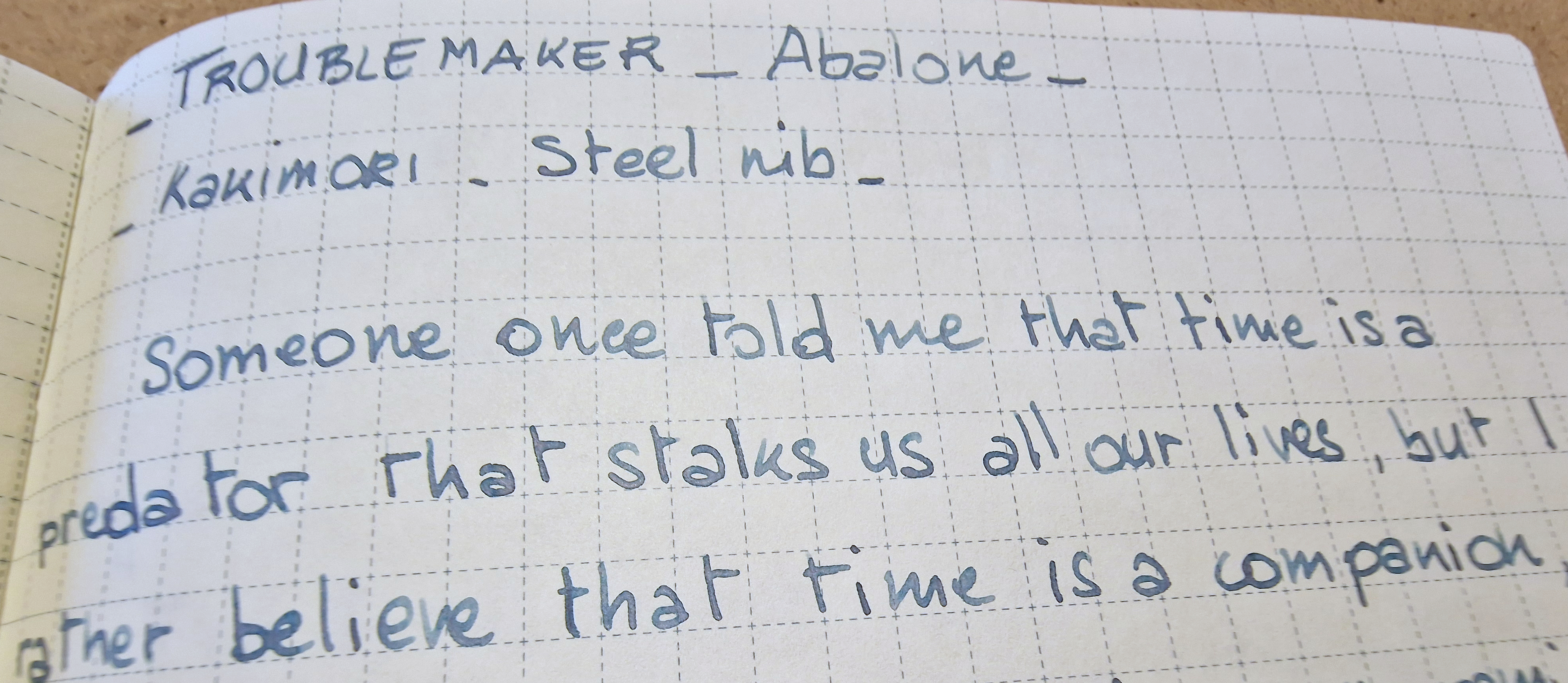 Alla normale scrittura, Abalone si presenta come un blu chiaro con sottotono tra il neutro e il freddo. E' un colore mediamente desaturato con buona capacità di shading nella scrittura con pennini da fini a salire. Il chromashading non si evidenzia nella scrittura a meno di usare pennini di generose dimensioni.