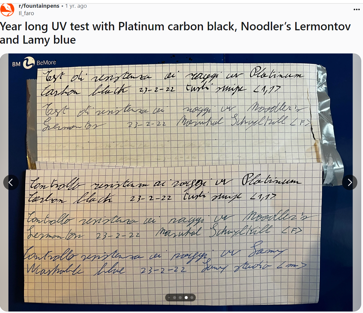 Io posso parlare solo per il Platinum Carbon Black, che ho testato con acquerelli e altri inchiostri. Una volta asciugato bene, resta lì. Mai testata l'archiviabilità, però, perché non è una caratteristica che cerco e non ho una buona finestra con cui riuscire a tenerlo esposto alla luce del sole a lungo. So che viene dichiarato sia waterproof che archiviabile ma non ho esperienza di prima mano di questa seconda proprietà.