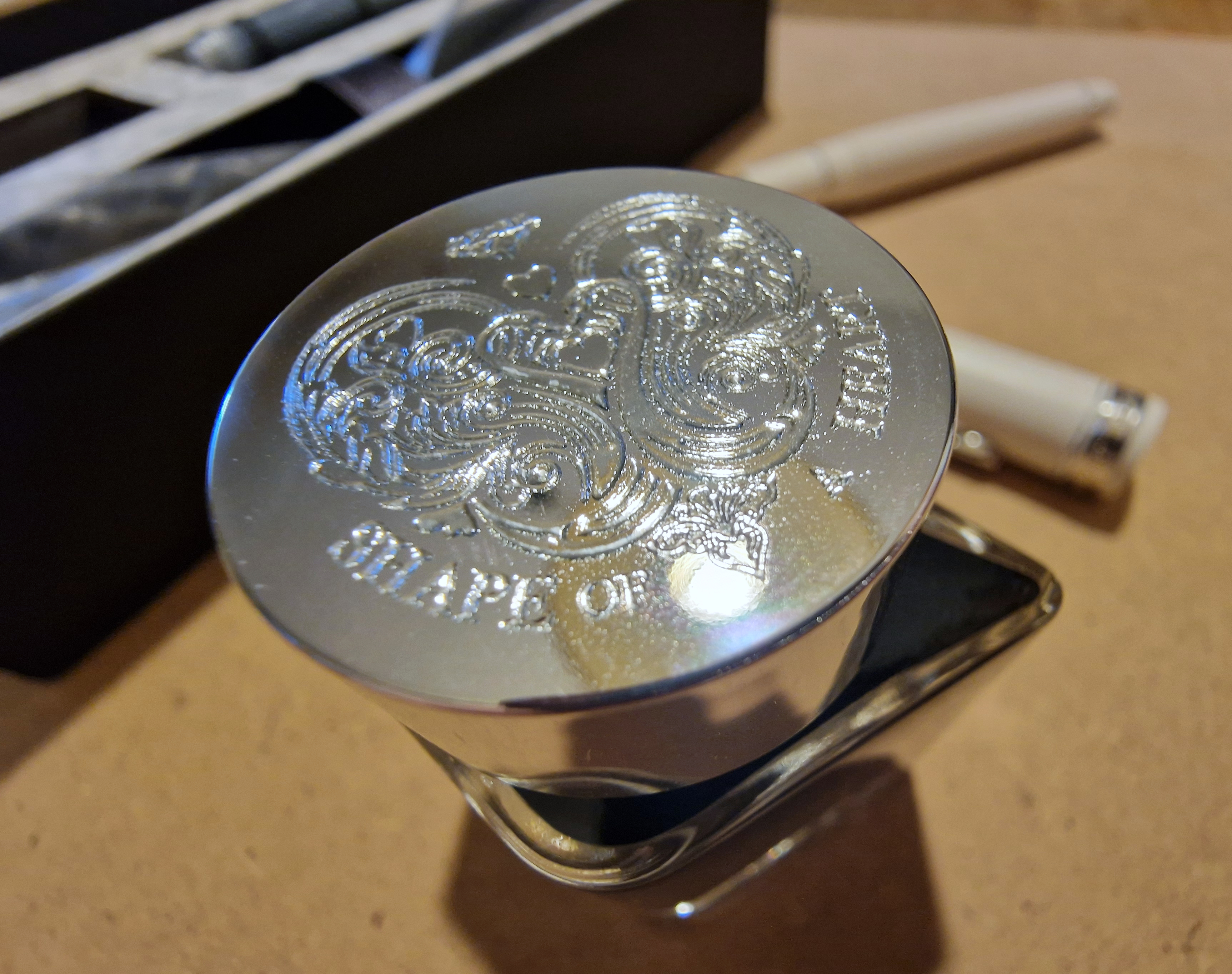 Il flacone dell'inchiostro incluso con la penna ha un tappo appositamente progettato per questo modello, con un motivo arabescato che rappresenta un cuore sormontato da un cristallo e la scritta "SHAPE OF A HEART".