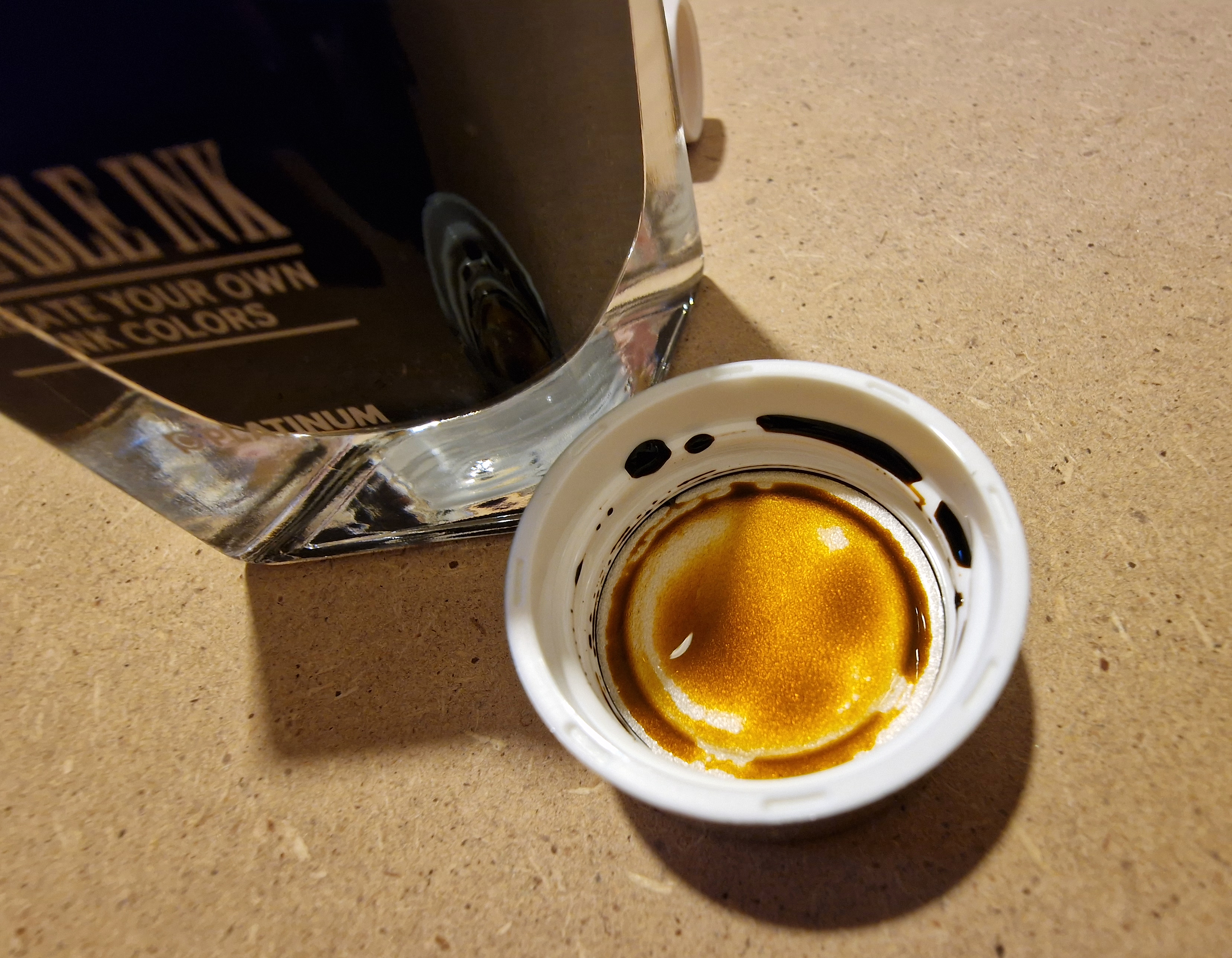 Non ho provato l'inchiostro e non ho intenzione di farlo, in parte per conservare il flacone così com'è, in parte perché solo sotto minaccia userei un qualunque colore che ricade nei marroni: no, grazie.