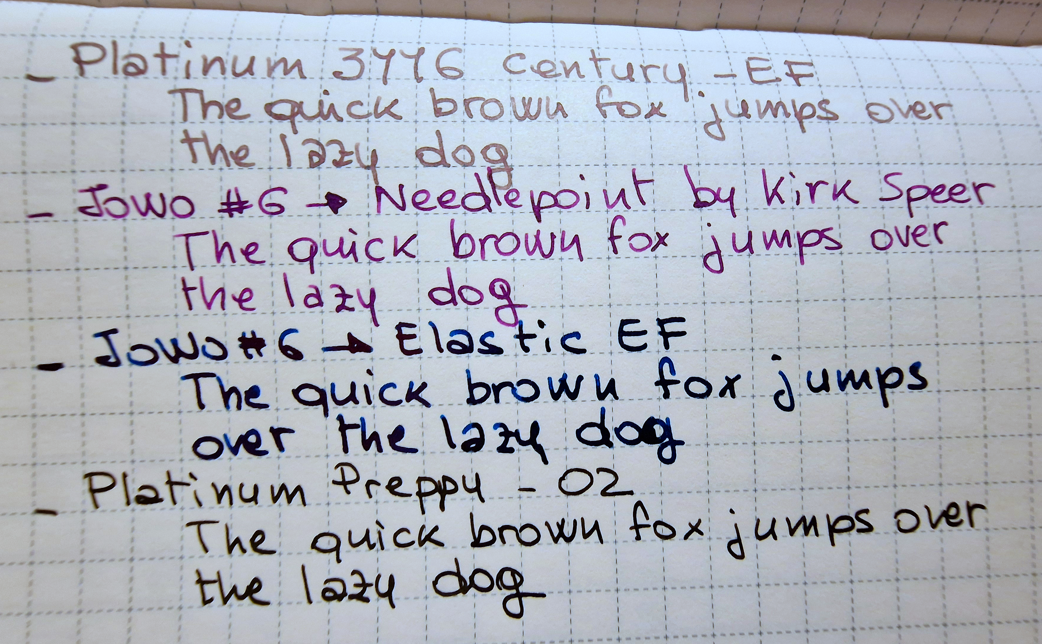Con R.O. Viola, l'ampiezza del tratto ricalca quella di un pennino Jowo modificato in needlepoint. Io ho una versione limata da Kirk Speer. E' possibile che con un inchiostro meno sbrodolone il tratto si assottigli e somigli di più al pennino 02 della Preppy.
