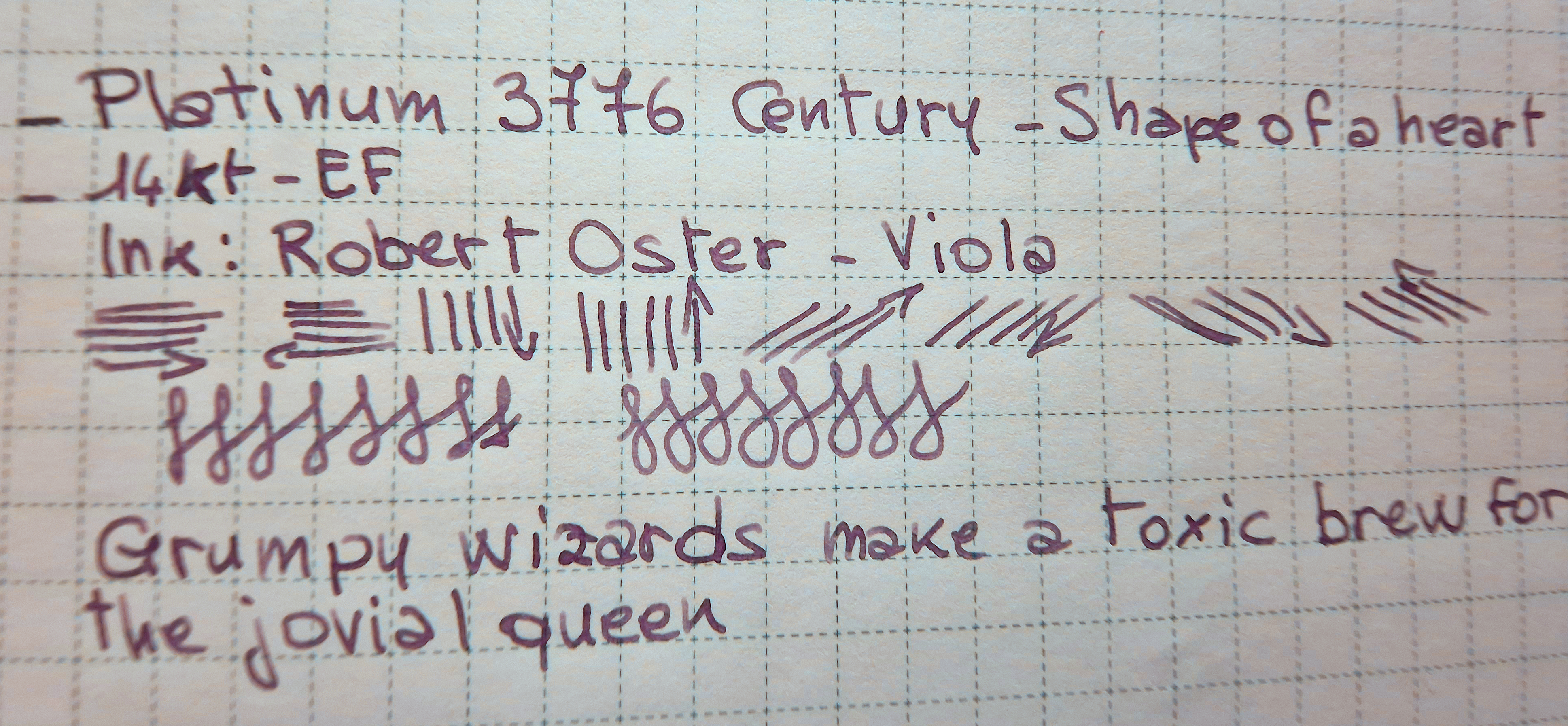Ho deciso di usare un inchiostro di Robert Oster: Viola. E' un inchiostro molto lubrificato, mi ricorda un po' il Pilot Iroshizuku Yama-budo: con una penna a intinzione è praticamente un obbligo fare un blob di inchiostro quando si comincia a scrivere. Trattandosi di un pennino extra fine giapponese, ho voluto provare a dare un piccolo vantaggio: devo dire che ho esagerato.