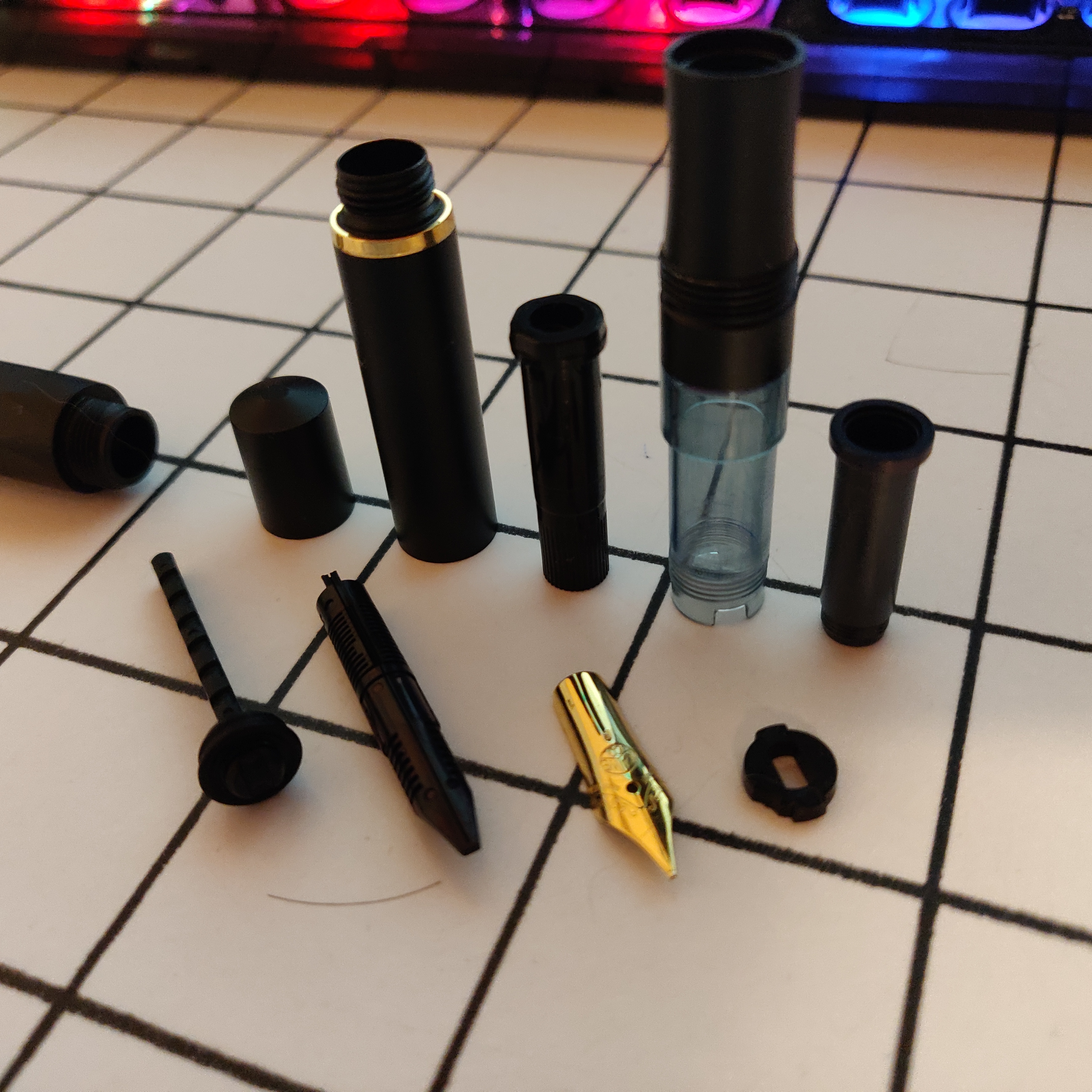 Attenzione: all'interno del fusto trasparente vi sono due guarnizioni, una piccola e spessa, che è quella che si appoggia sul fondo del gruppo pennino e una più grande, ma sottile, che è quella che chiude la parte verso il pennino del gruppo. Inoltre, nel tappo c'è un contro-fondello (credo si chiami così) in plastica, anch'esso trattenuto da una guarnizione super sottile. Quindi, oltre agli elementi in forografia, non perdetevi le tre guarnizioni.