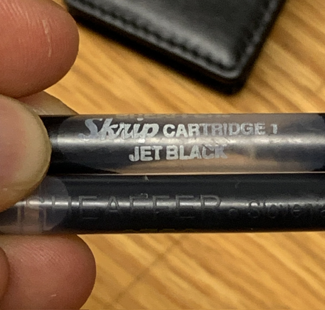 Ho scovato nel cassetto un paio di cartucce Sheaffer di "ere" differenti, una moderna e una marcata "Sheaffer skrip cartridge 1 Jet Black" metto foto comparative, le dimensioni esterne sono identiche, cambia la forma dell'imboccatura: quelle moderne hanno una specie di collarino con una pallina di chiusura, quelle vecchie hanno una semplice copertura di plastica piatta.