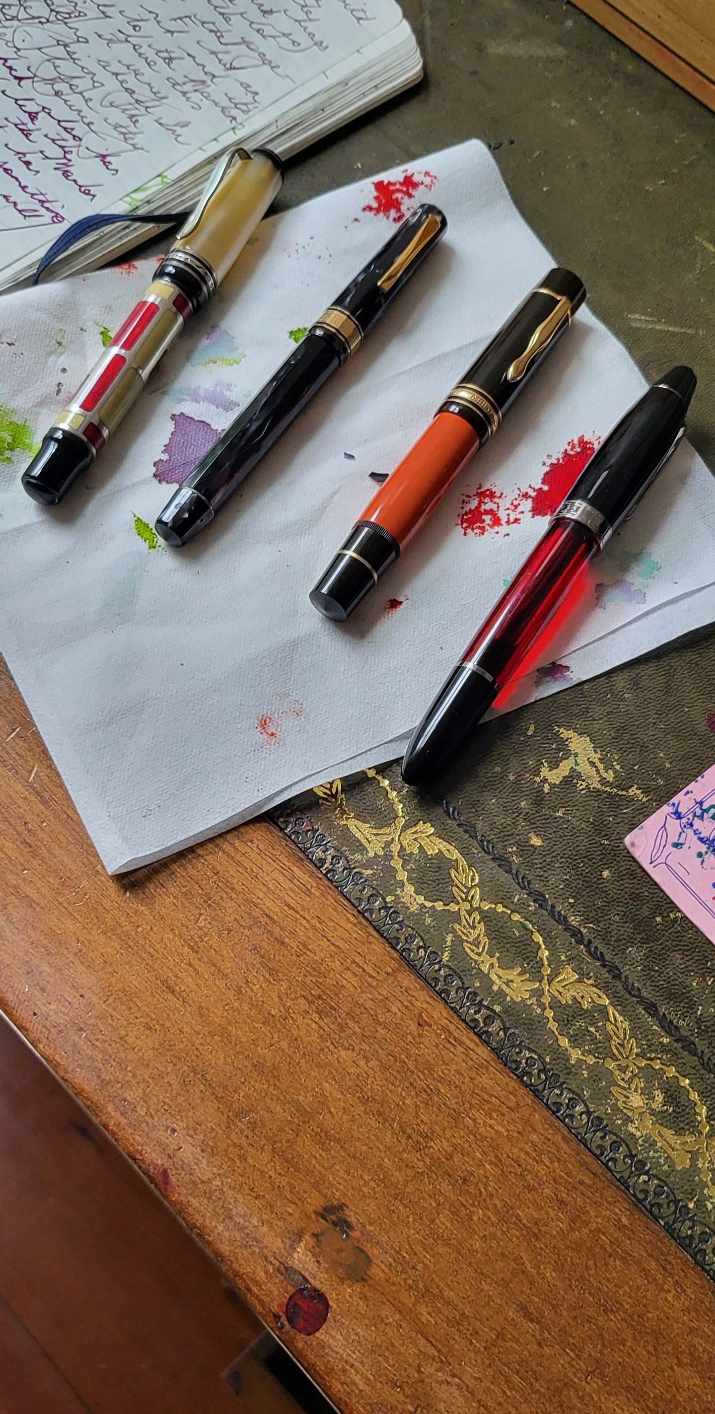 Ho quattro penne piene di inchiostro. La forum Duchess è riempita con inchiostro Parker Penman Ruby e rimane la mia penna preferita. La MBH è riempita di yama-budo, un colore che aiuta a illuminare le brevi giornate invernali. La Omas Gentlemen è riempita con Parker Quink nero e infine la Marlen 'Forme' del 2003 è riempita con un altro iroshizuku, il chiku-rin.