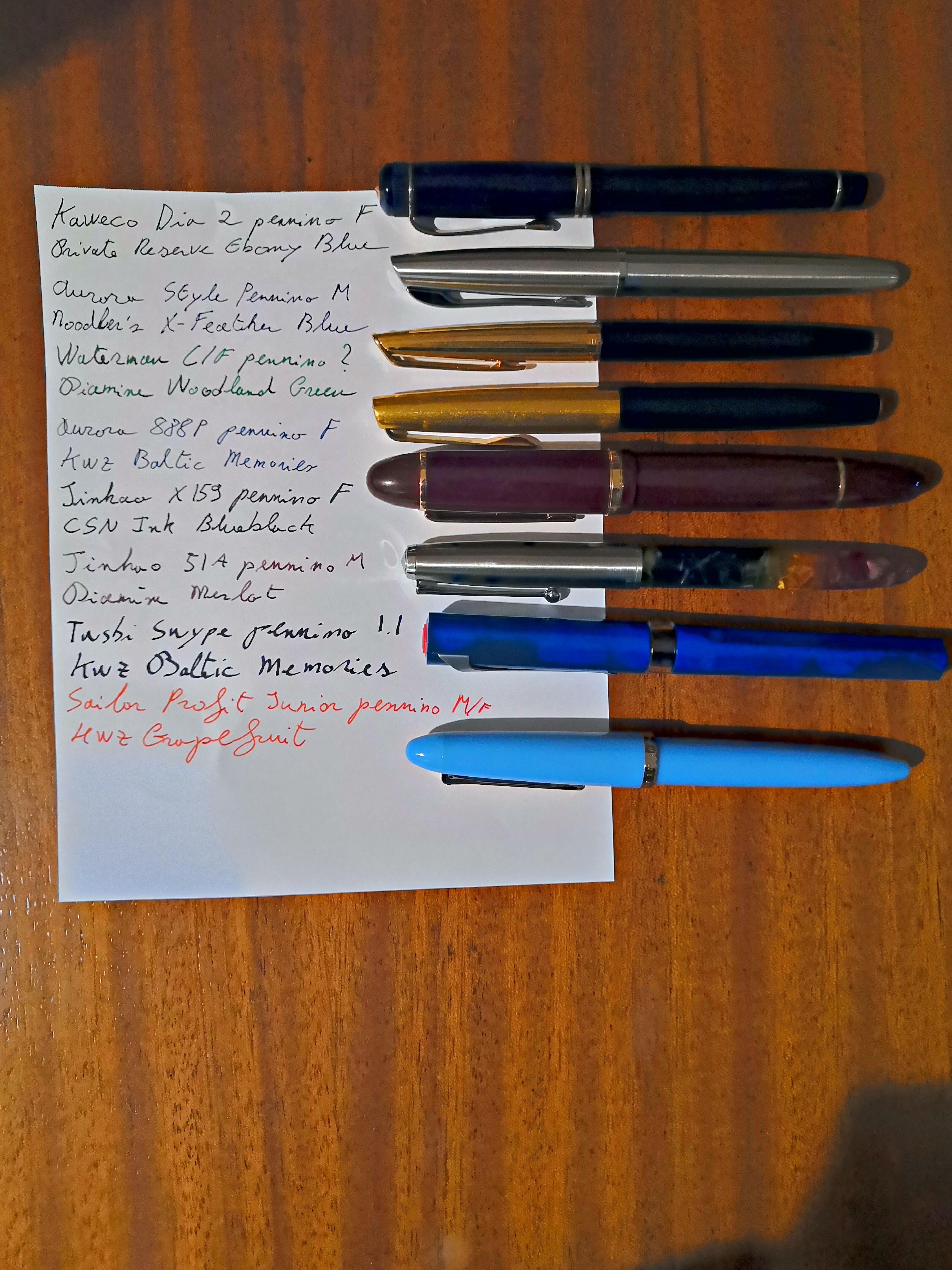 Io le mie penne non le tengo sulla scrivania (a meno che le stia usando in quel momento), sono nel mio zaino, ma ecco il mio attuale parco di penne attive e relativi inchiostri.