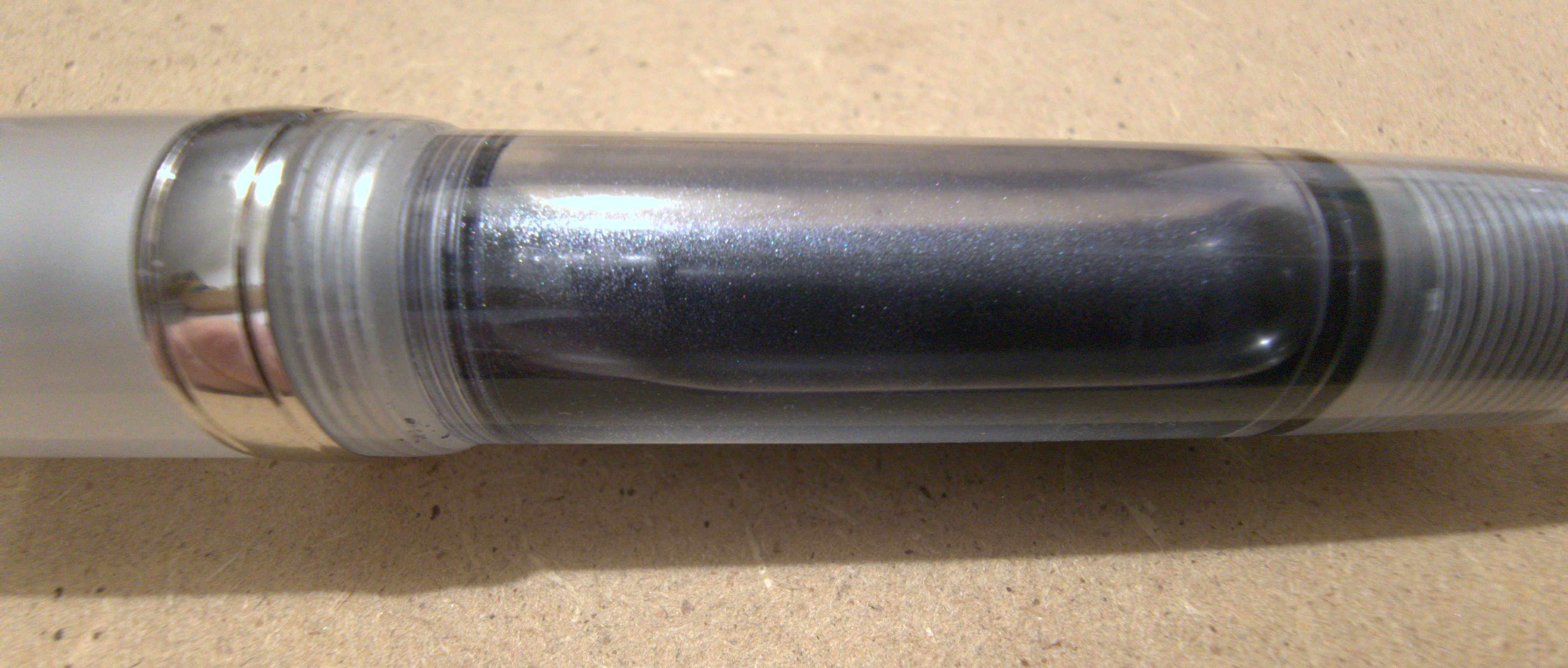 Si può vedere anche nel serbatoio della penna che la quantità di glitter è ben più bassa dell'atteso: è chiaro che il sample che mi è arrivato conteneva il fondo del flacone, dove erano precipitati tutti i brillantini.