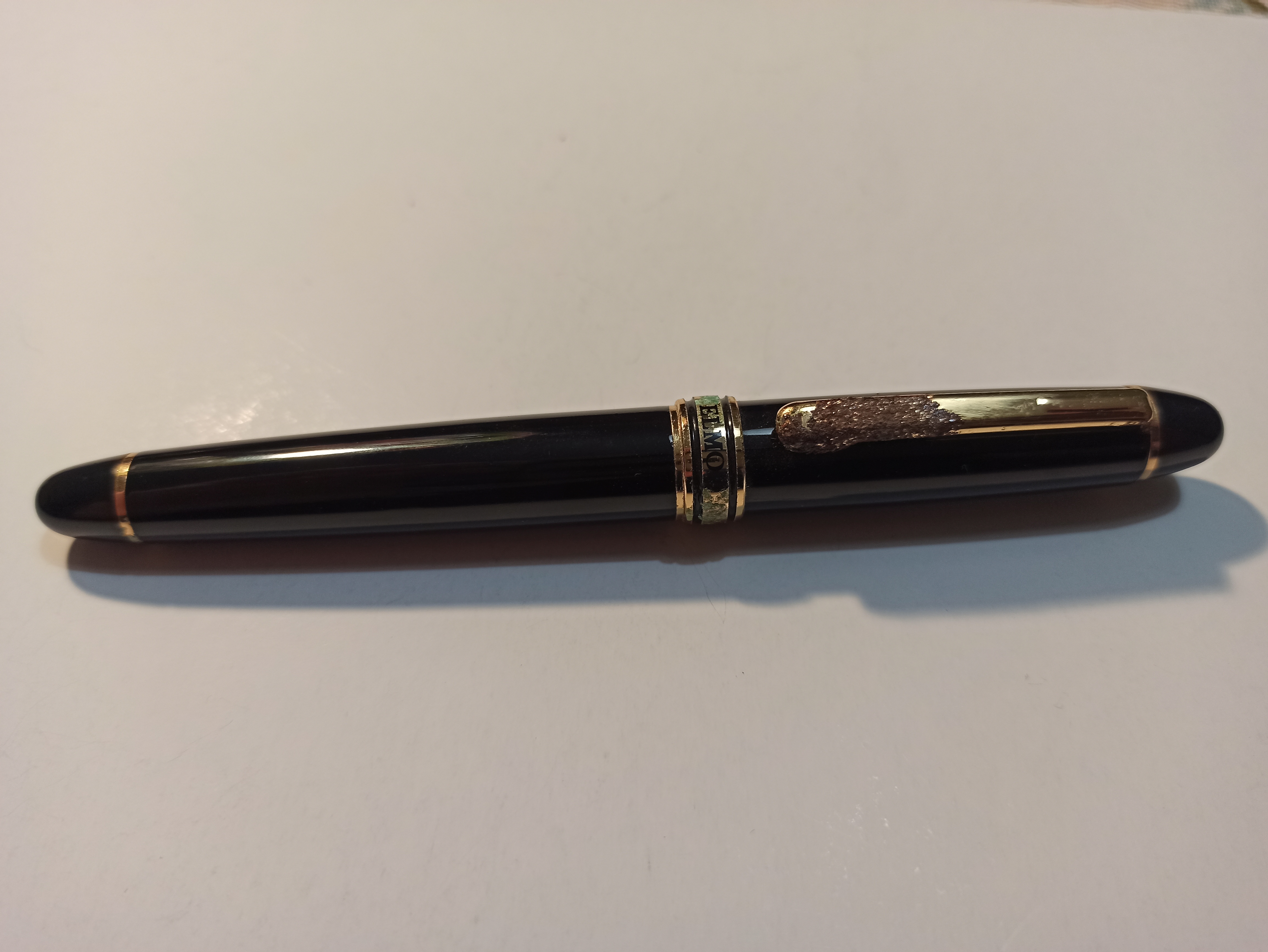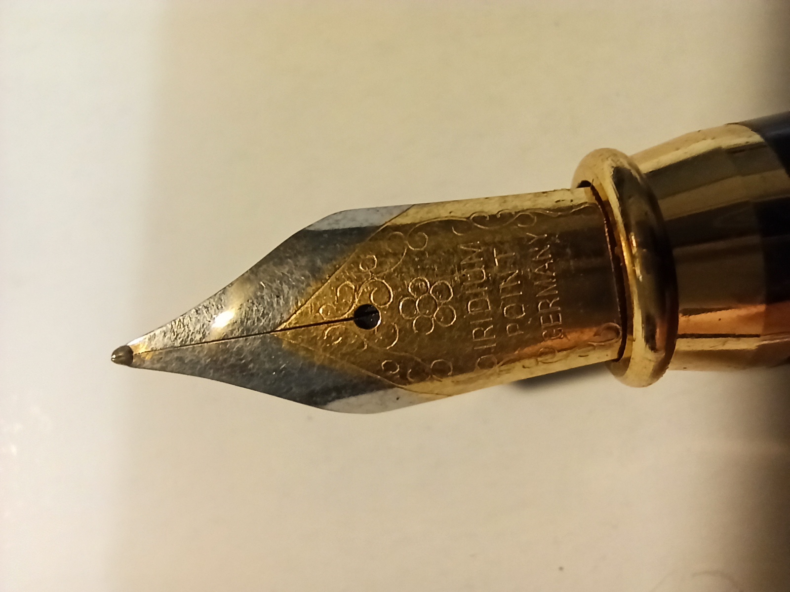 Per quanto riguarda il pennino, di solito gli "iridium point Germany" sono pennini di fabbricazione cinese montati su una vasta gamma di penne anonime, cioè senza marchio particolare. Quella sezione con la banda dorata alla fine verso il pennino mi fa proprio pensare a una di queste produzioni.