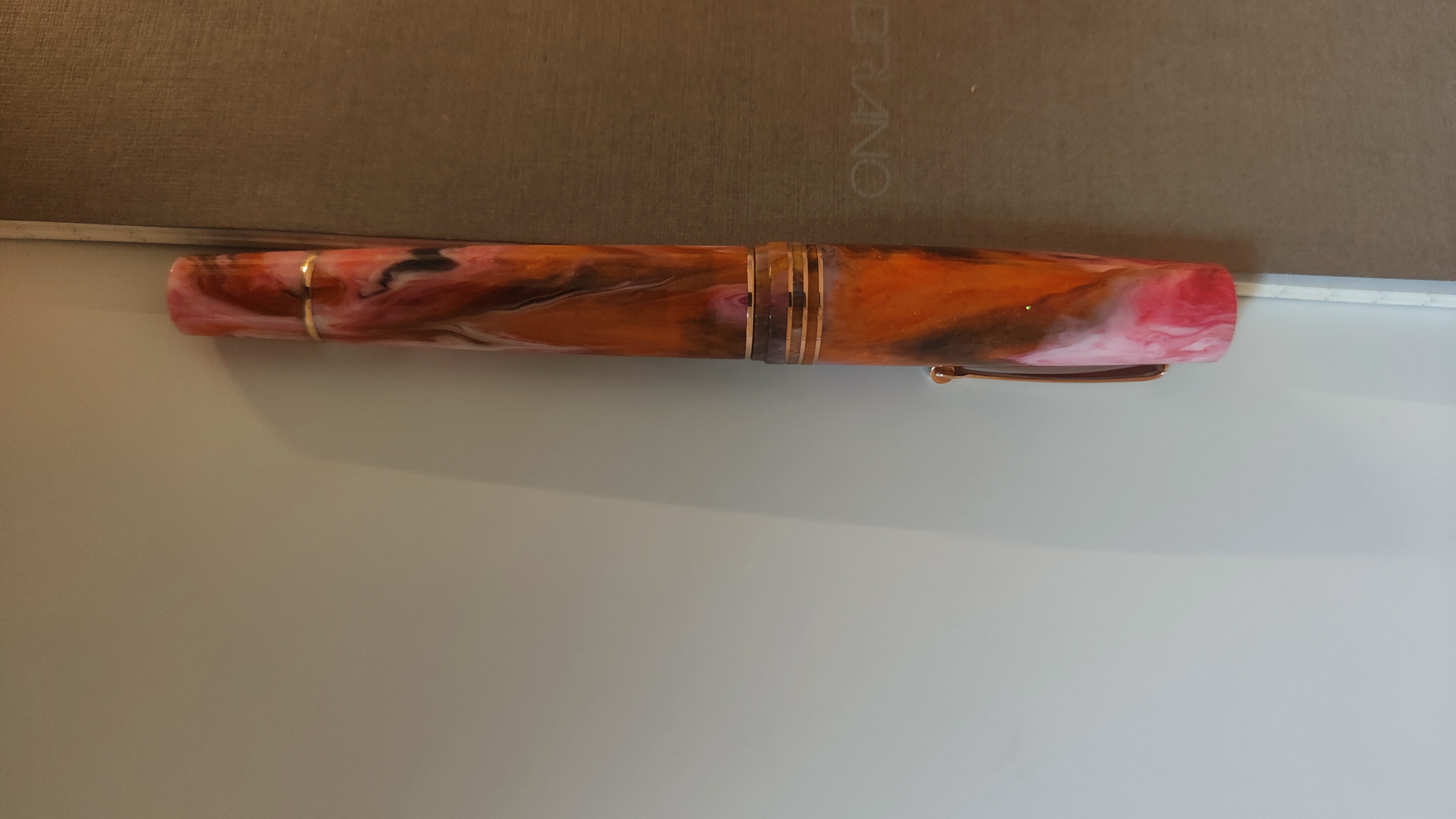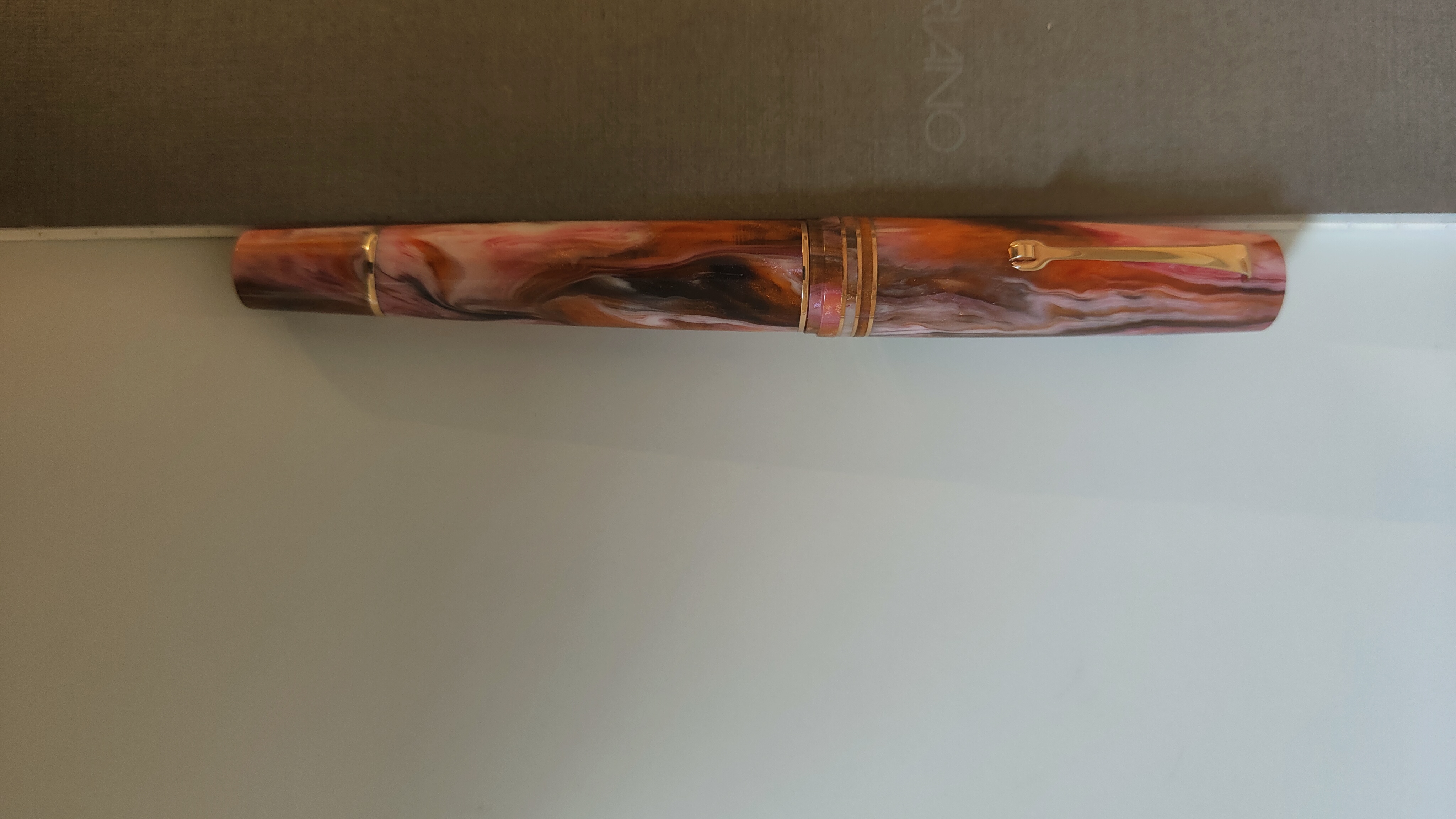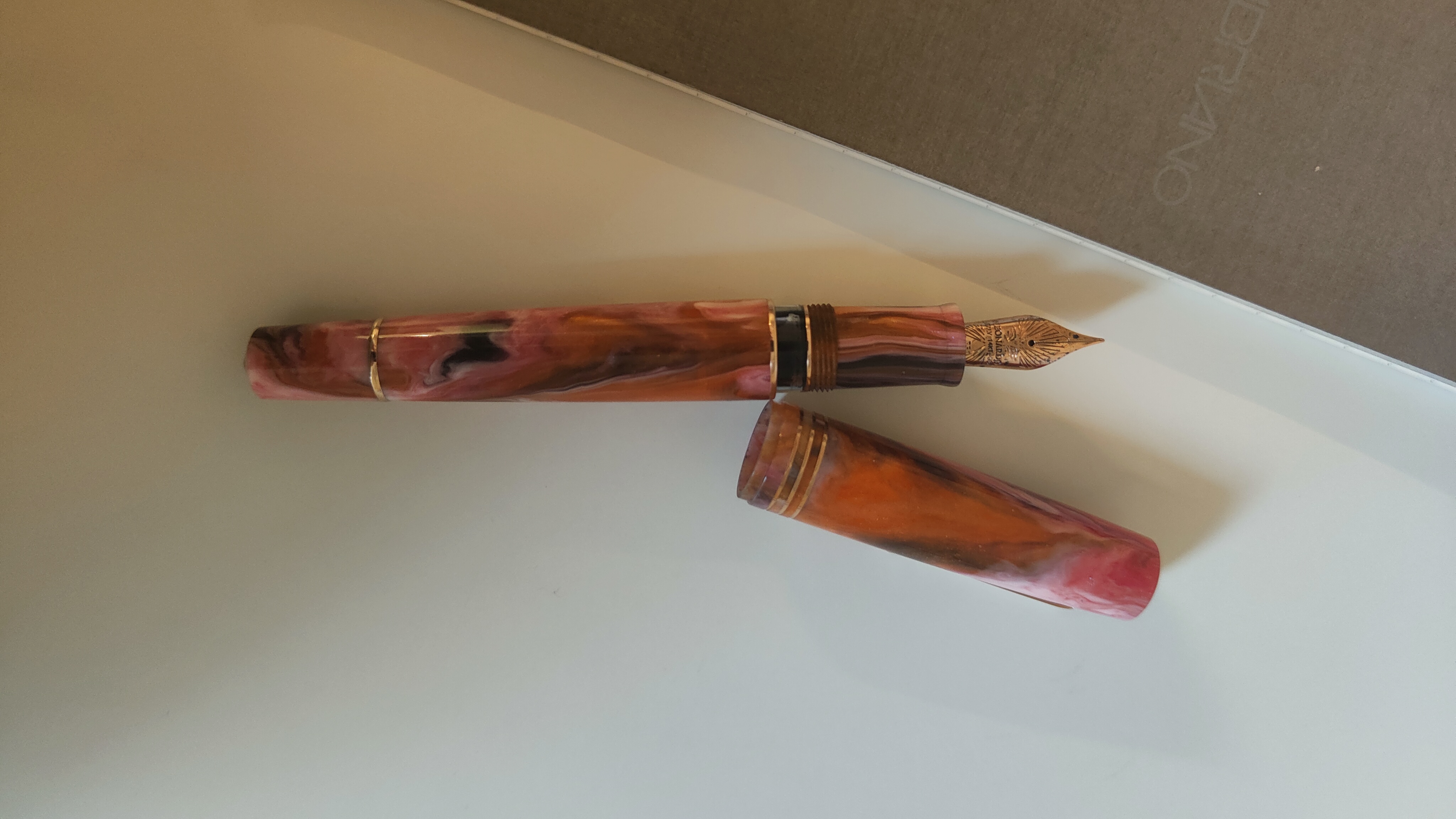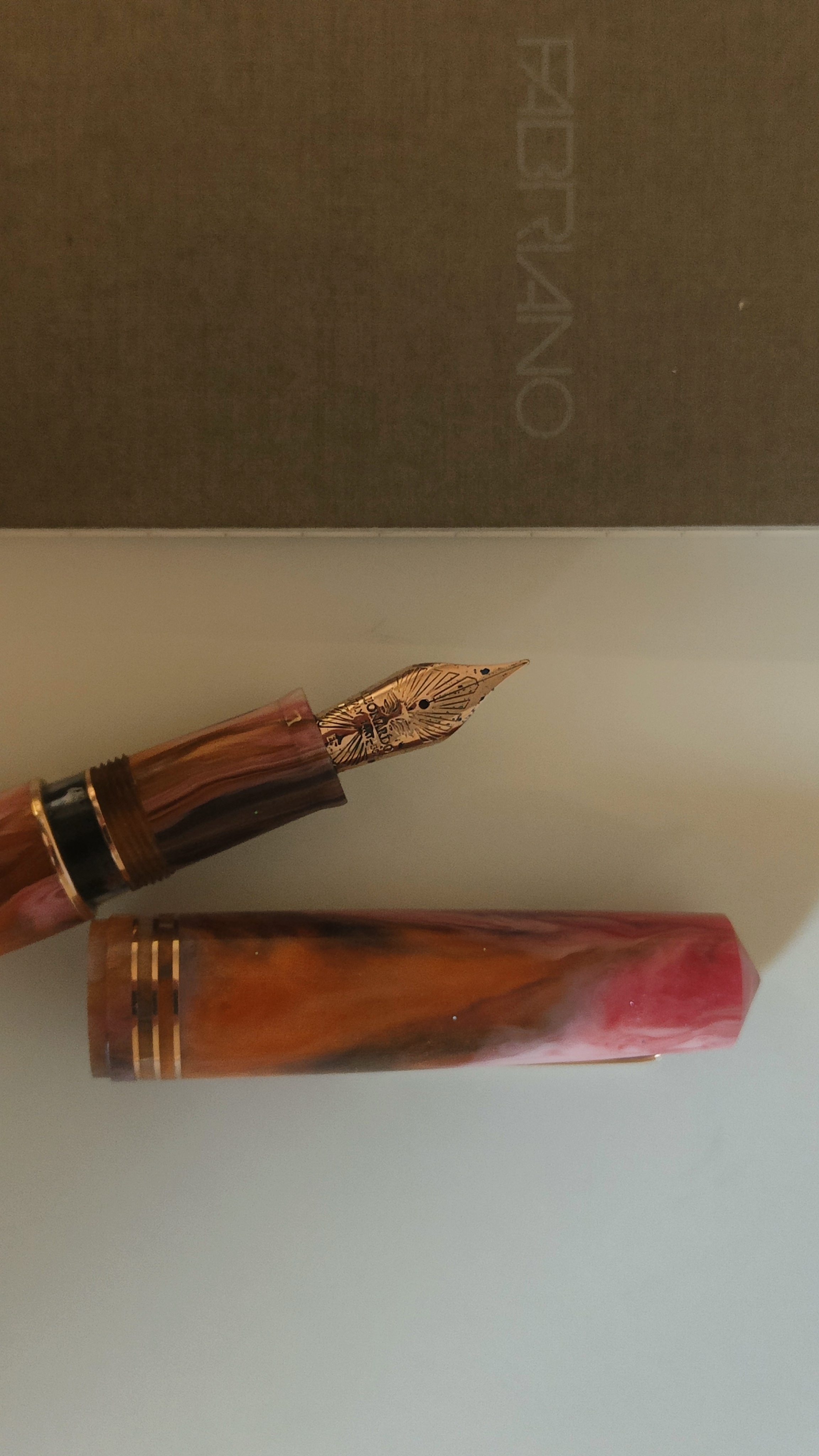 So che queste resine sono molto controverse. Io ne sono entusiasta: mi piacciono le linee classiche abbinate a simili mescole di colori. I toni rosa e arancio sono tra i miei preferiti, insomma non potevo perdermela! Inoltre, la penna in resina, meno affascinante delle ebaniti (che che ho) e delle celluloidi (che non ho, tranne una Omas gentlemen nera) è davvero pratica, in particolare se lucida. Puoi lavarla e, se dimentichi in ammollo, non succede niente. Puoi caricarla con qualsiasi inchiostro e non resta traccia dopo il caricamento. Puoi lasciarla in qualsiasi posto (da cui non voli!) senza preoccuparti della luce e delle sue conseguenze sul materiale. Per rimanere in tema di praticità, altro particolare non trascurabile, è il cappuccio che internamente ha tre diametri: il più piccolo combacia con l'inizio della sezione. La penna può stare ferma giorni e giorni, a me è sempre ripartita al primo colpo.