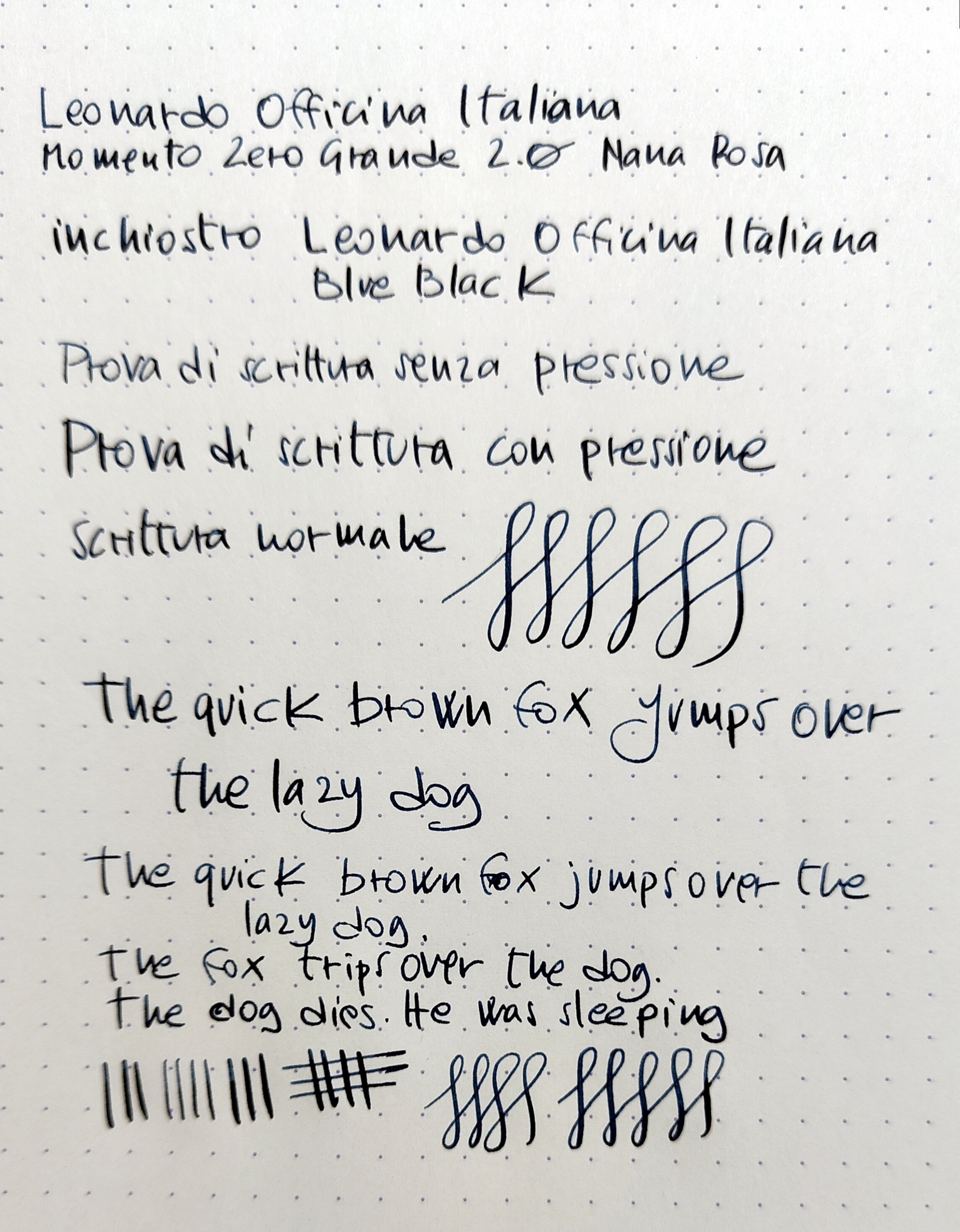 La cosa più interessante della mia Nana Rosa è che il pennino in oro, Fenice oro 14k EF (in-house di Leonardo), non è montato sul classico alimentatore di ebanite ma su un alimentatore in ABS standard JOWo. L'accoppiata mi è stata proposta dal produttore. Ero scettica, perché possiedo già un Fenice oro, pennino classificato come rigido che, però, ha un certo molleggio e i rebbi si aprono, non da flessibile ma abbastanza per produrre una variazione di tratto. Il mio timore era che l'alimentatore in ABS non reggesse l'erogazione di inchiostro necessario. Non solo l'alimentatore funziona benissimo ma il pennino per essere adattato all’alimentatore in ABS di JoWo va "inarcato" perché segua la geometria. Questo Fenice è più molleggiato dell’altro su ebanite. La sensazione di scrittura non è quella che si ha con un pennino rigido, la morbidezza è davvero notevole. Sono aperti altri thread in cui si discute anche sulla definizione di elastico e/o flessibile, che è sempre molto controversa. Io questo pennino faccio fatica a definirlo rigido. Aggiungo due esempi di scrittura che forse mi aiutano a spiegarmi meglio.