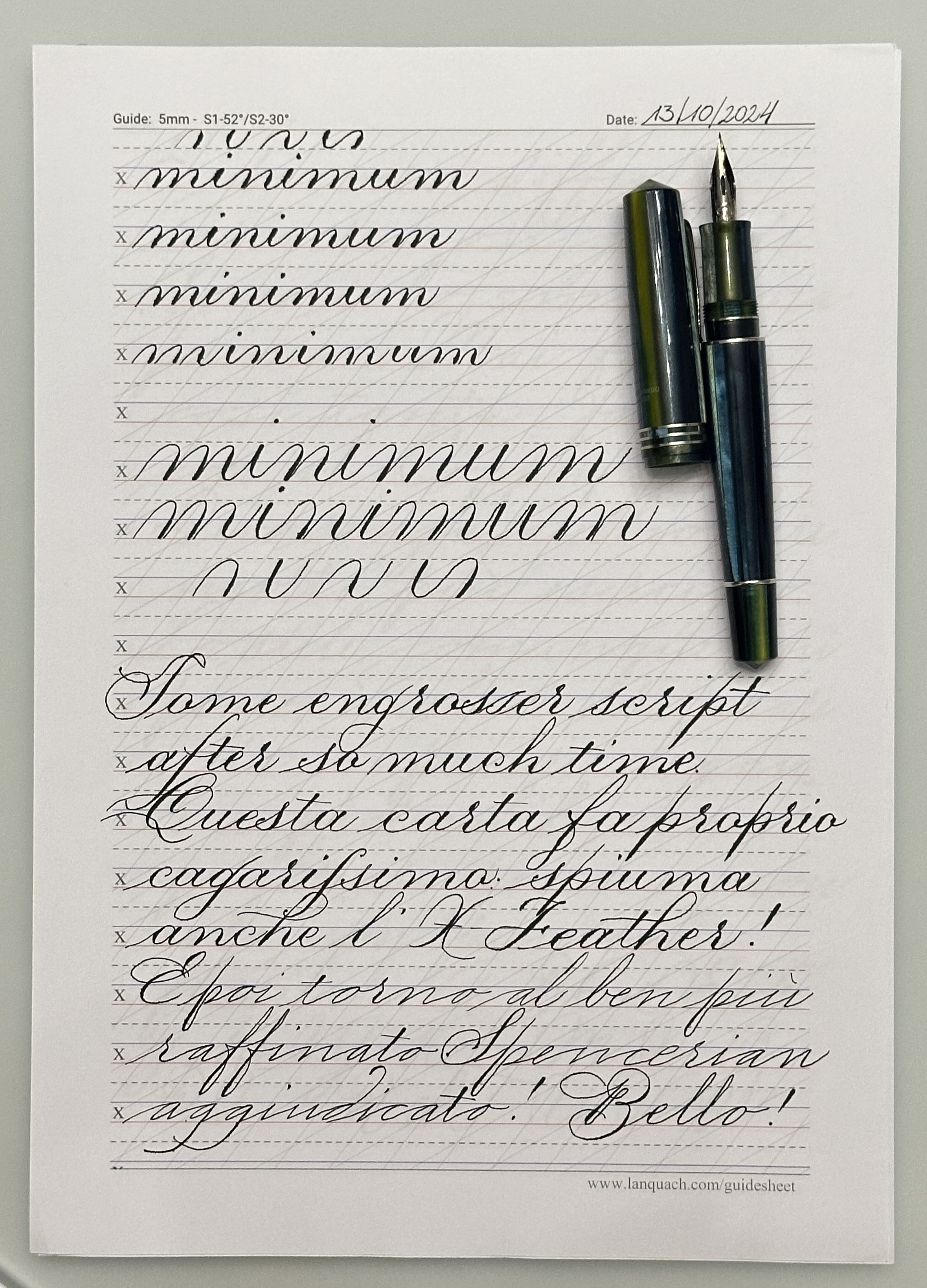 Una paginetta dopo tanto. Prima metà dedicata ai tratti base, fondamentali per la buona riuscita del testo calligrafico.
