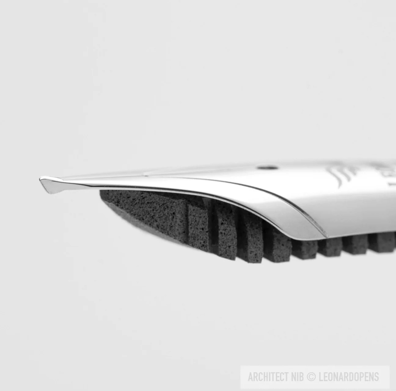 Confrontato con l’Architect di Leonardo Si vede che l’architect è piatto con spigoli abbastanza vivi e deve essere usato sempre con lo stesso angolo, altrimenti scrive sullo spigolo con un tratto praticamente EF. È un problema se l’angolo del pennino non è quello che usi tu.