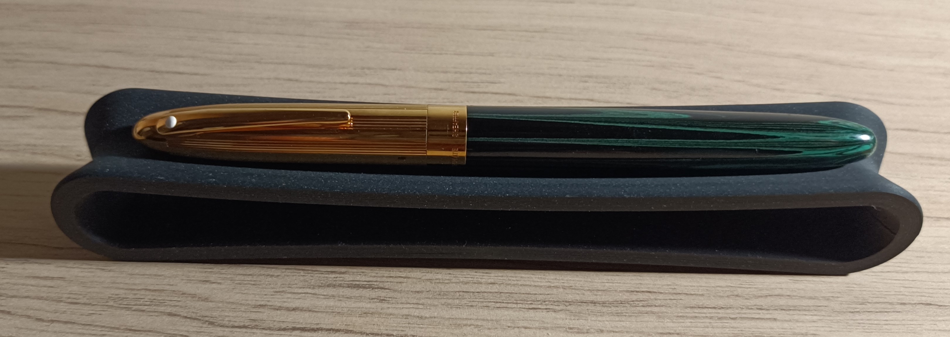 In conclusione si tratta di una penna che ho apprezzato molto per vari motivi: mi piace il design, le dimensioni sono ottime per la mia mano, il pennino è piacevole da usare e una goduria da guardare. Forse agli occhi di un collezionista il fatto che il fusto non sia quello originale fa perdere valore all’esemplare, ma per me è perfetta così, ha il valore aggiunto di essere un esemplare unico. Un po' un peccato per il reverse: evidentemente la riedizione moderna di questo pennino non è stata pensata esattamente come quella originale, ma lo considero un aspetto veramente secondario, di solito non sto a rigirare le penne mentre scrivo. Non ho una grandissima collezione di vintage, ma da quelle che ho provato posso dire di avere una predilezione tra le americane proprio per Sheaffer, e sicuramente questa penna depone a favore di questa inclinazione.