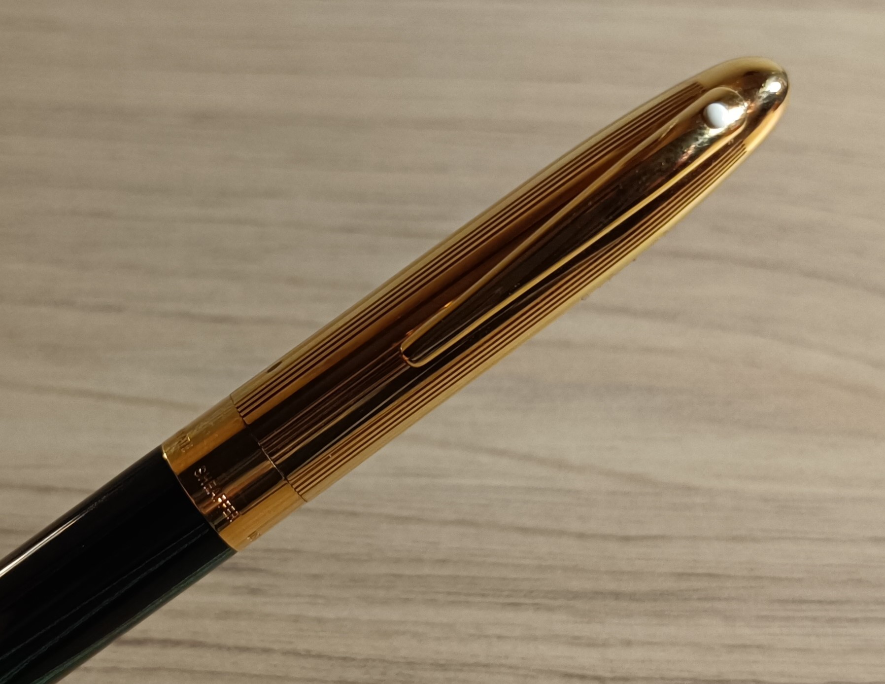 Per quanto riguarda la descrizione esteriore della penna, da chiusa essa si presenta con una forma a sigaro senza interruzioni della linea esterna, come dicevo il cappuccio è in metallo placcato oro con la tecnica della galvanostegia, presenta una decorazione a righe raggruppate a gruppi di quattro che si interrompe sulla sommità, che è lasciata liscia, e alla fine, creando una sorta di banda sul limite inferiore della quale sono incise le scritte: “GOLD ELECTROPLATE / SHEAFFER / USA”. Da notare che uno dei fasci di righe, è troncato e lascia uno spazio vuoto nel decoro, molto probabilmente allo scopo di accogliere un’incisione con un nome, una data ecc. La clip è molto semplice, a molla, e presenta il pallino bianco prima simbolo della garanzia a vita e poi divenuto il logo della Sheaffer incastonato sulla sommità, leggermente sporgente. Il corpo è in una bellissima ebanite a fondo nero con striature verdi che ricordano molto le venature del legno, perfettamente lucidata e levigata. Le dimensioni sono piuttosto contenute: circa 134 mm da chiusa, circa 116 mm da aperta. Anche il diametro è piuttosto contenuto.