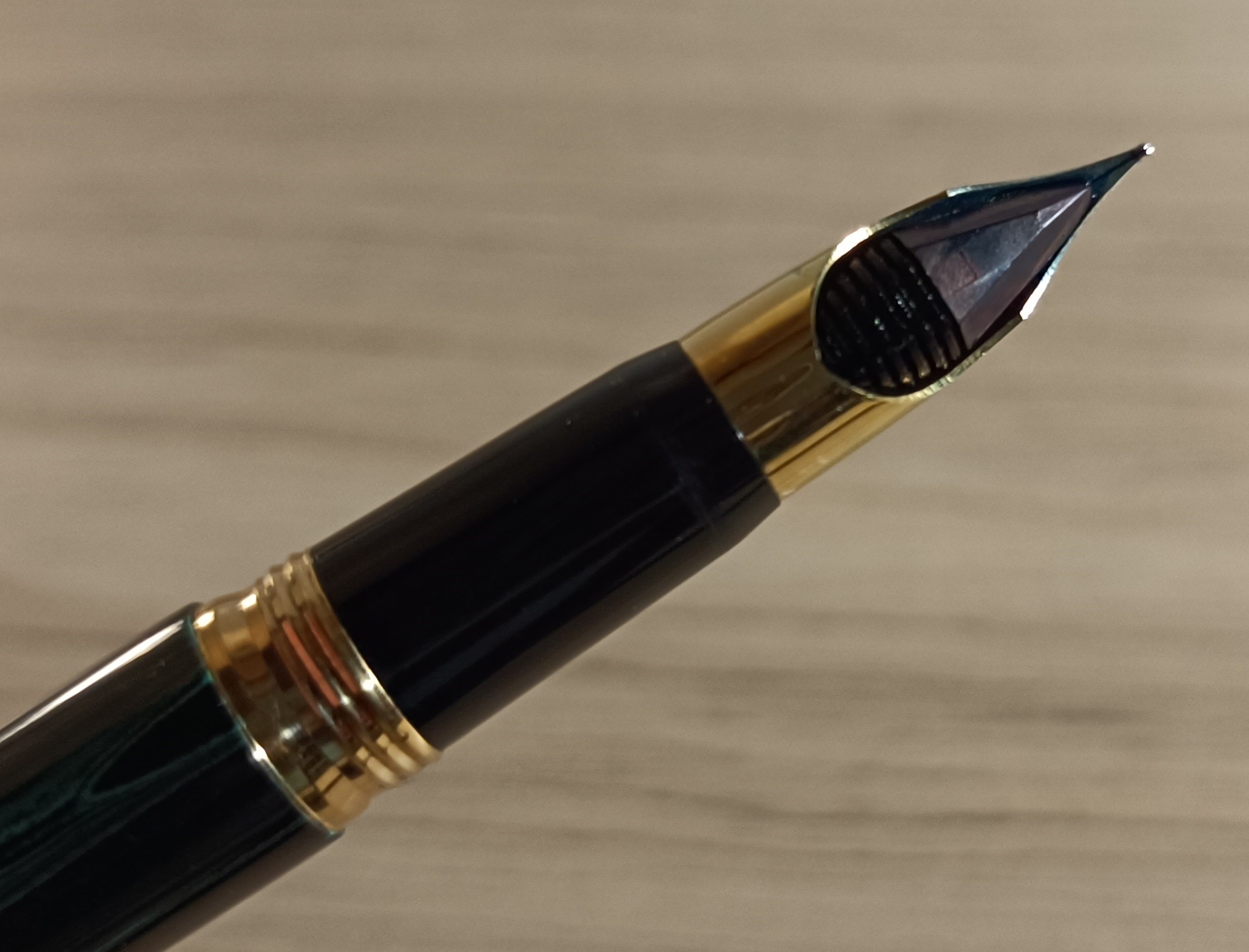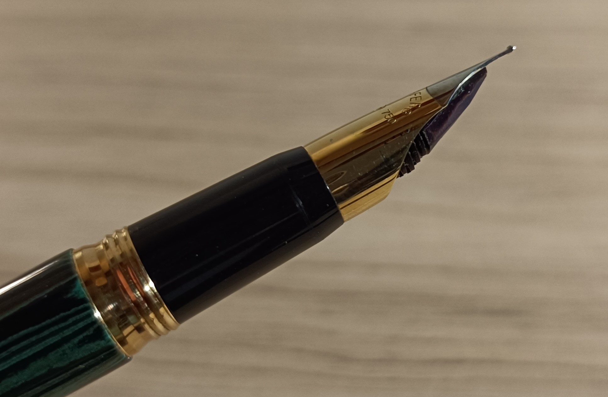 Veniamo dunque alla scrittura: il pennino è di tratto dichiarato M (così è inciso sulla parte inferiore della sezione; non provo neanche a mettervi una foto perché si vede solo in controluce, ma vi assicuro che c’è la leggera incisione di una “M”) ma, secondo me, scrive proprio come un fine europeo, non si avvicina neanche lontanamente agli M Pelikan o Montblanc. Il pennino ha una scorrevolezza che definirei “frenata”, nel senso che ha un certo mordente sulla carta, senza mai graffiare veramente, ma si sente un certo feedback (per me cosa molto buona perché mi permette di controllare meglio il tratto, per chi predilige pennini molto scorrevoli non credo faccia al caso loro) e a livello uditivo “canta” molto sulla carta (soprattutto usando carte più porose viene fuori un bello ASMR). Il pennino per la sua configurazione è ovviamente molto rigido, credo che si potrebbe considerare quasi un “manifold” o “accountant nib”, anche se essendo in oro 18 carati non metterei alla prova la sua resistenza (con i pennini ci scrivo, mica ci zappo). Come flusso lo trovo perfettamente regolato, un po’ sul bagnato, non perde un colpo ed è veramente piacevole da usare. La particolarità di questi pennini era quella di poter scrivere bene anche sul lato secco, cioè con il pennino ruotato di 180 gradi, fornendo un tratto più sottile. In questo caso il cosiddetto “reverse writing” è assolutamente possibile, ma la punta acquisisce ancora più feedback diventando per me quasi fastidioso. Il flusso è abbastanza continuo e si ottiene un extrafine, molto utile, quasi come avere due penne in una; un pochino meno feedback e sarebbe stato perfetto come pennino a doppio tratto. A chiunque piacciano i pennini rigidi consiglio vivamente di provare uno di questi pennini conici.