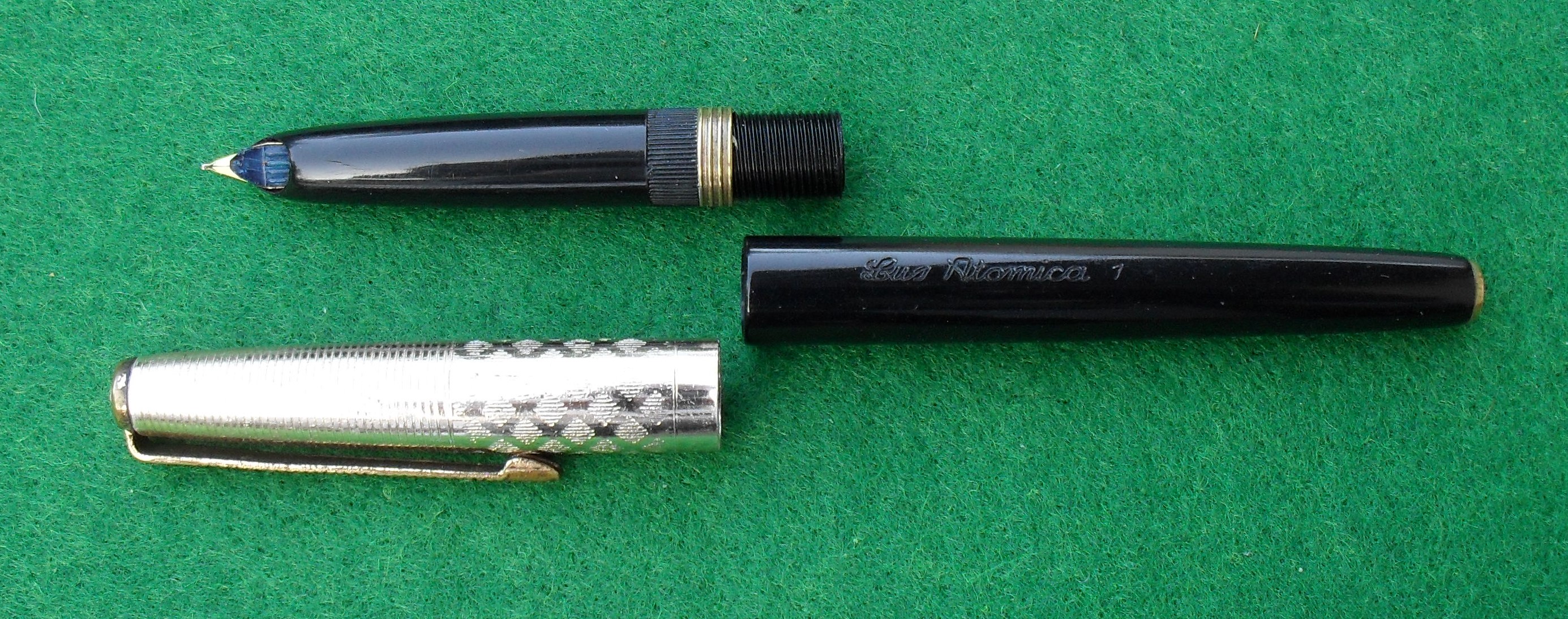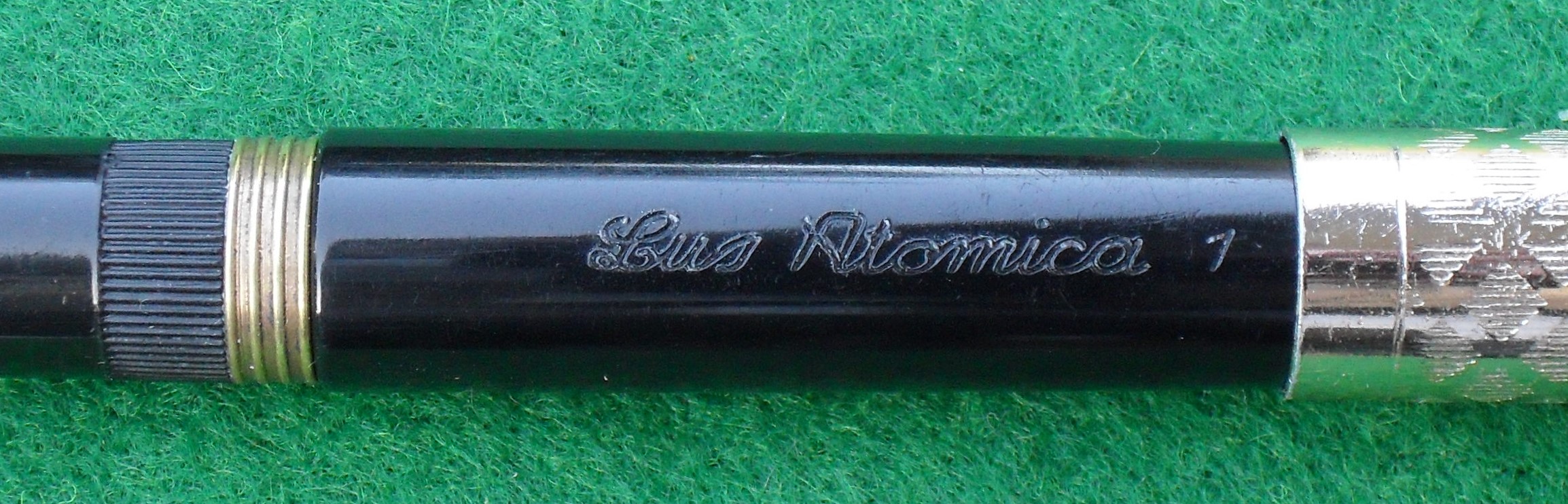 La sagacia commerciale e comunicativa di Legnani si ravvisa anche nel nome della penna: non solo, tema caldissimo in quegli anni, si fa riferimento all’atomica, ma sugli espositori si aggiunge anche la dizione “N° 1”, suggerendo che si tratti d’un prodotto in grado di primeggiare. Secondo Giovanni Abrate (https://newpentrace.net/articleGA02.html), la LUS Atomica precedette l’Aurora Duo-Cart e la Waterman CF nell’uso del sistema d’alimentazione a cartuccia. Parliamo, naturalmente, della cartuccia in materiale plastico, giacché l’uso d’un serbatoio interno mobile fu sperimentato ben prima del secondo dopoguerra.