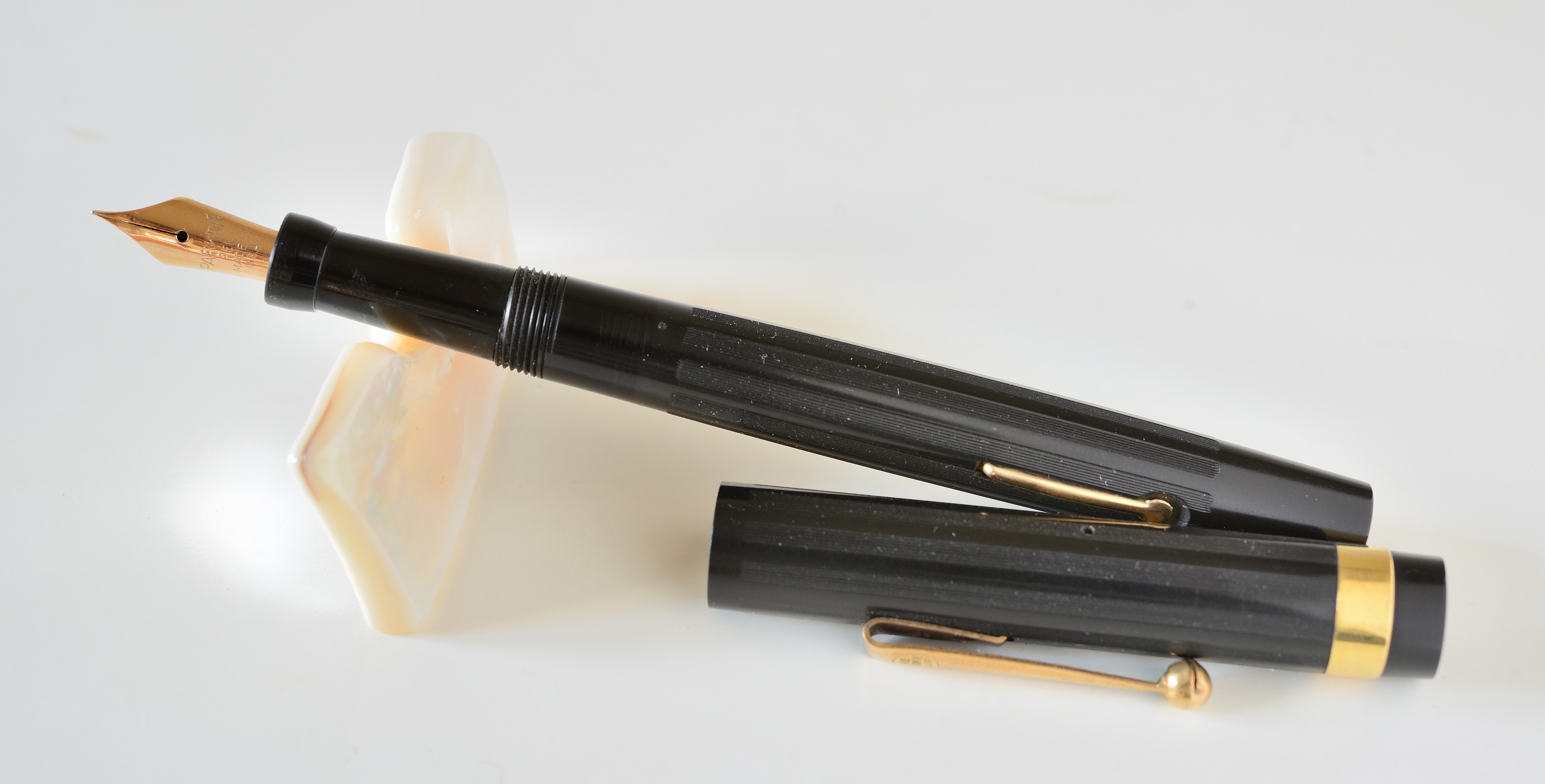 In ebanite incisa, caricamento a levetta. Purtroppo il pennino non è suo, è un Parker di alcuni anni dopo, in oro.