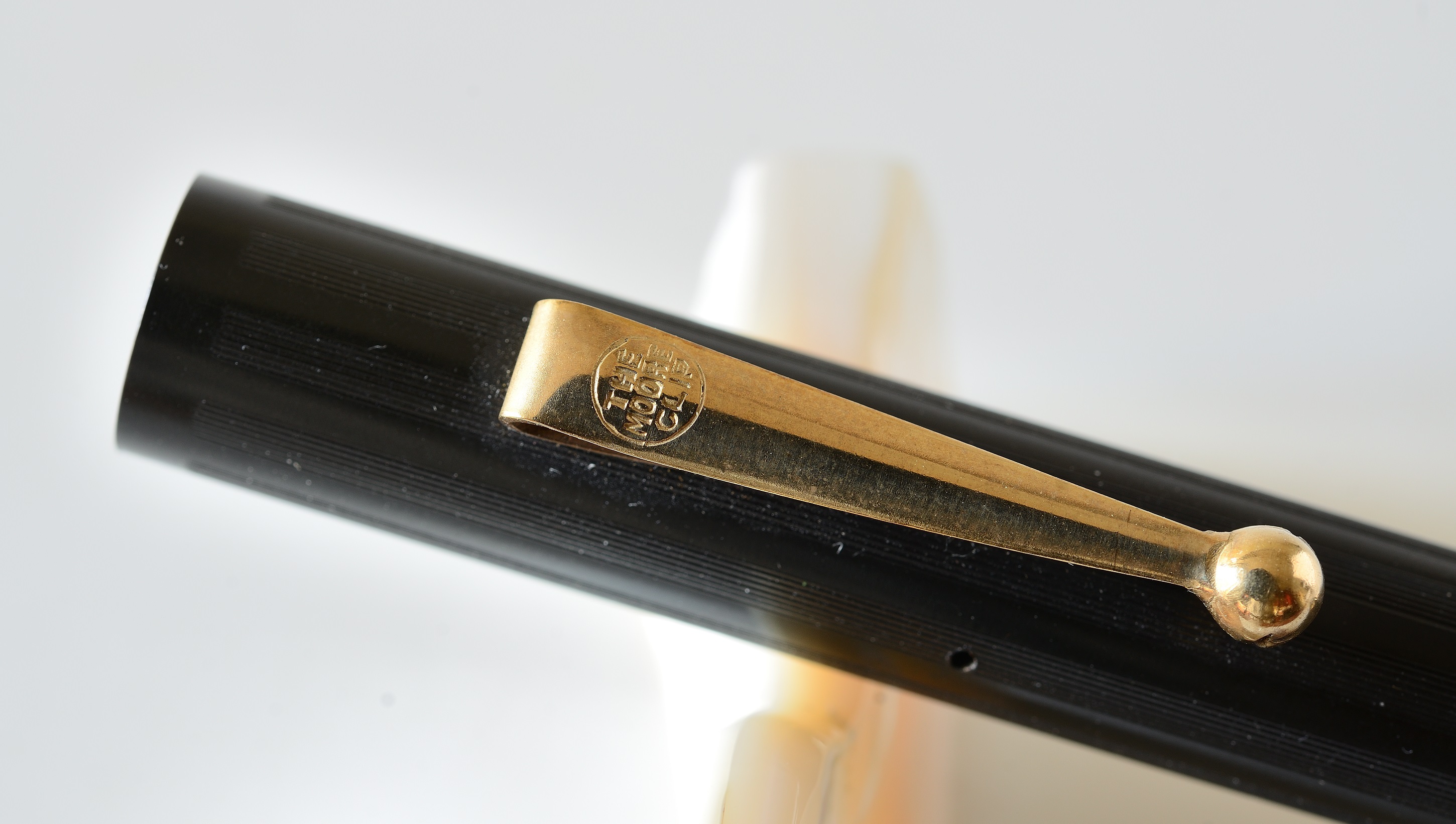 Al corpo la scritta: LEVER SELF - FILLING, THE MOORE PEN CO, BOSTON MASS USA, su tre righe, clip dorata con punzonatura circolale e scritta THE MOORE CLIP, sotto il fondello la sigla L - 92.