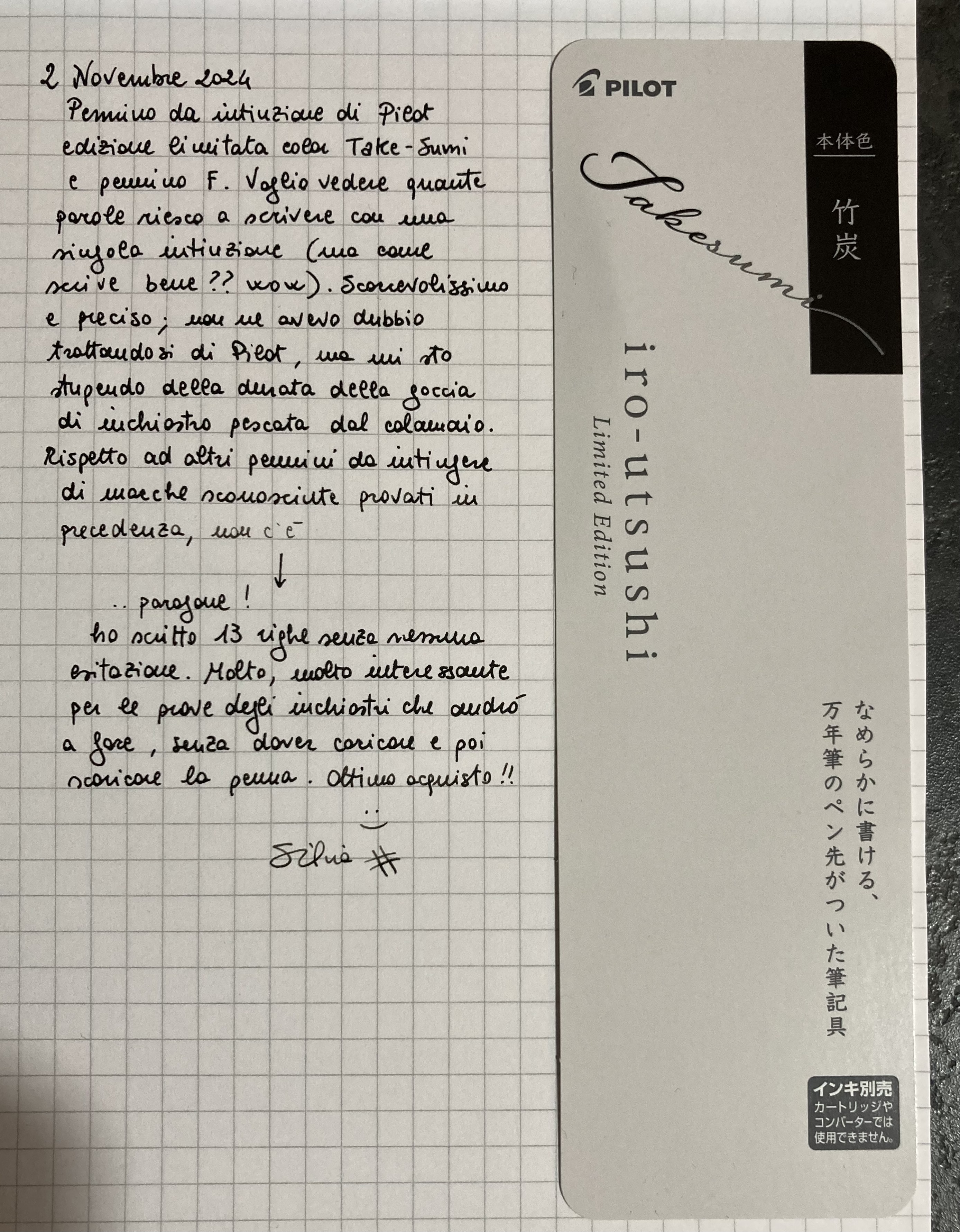 Silvia1974 ha scritto: ↑sabato 2 novembre 2024, 18:21 Ecco la prova del pennino da intinzione appena preso, un Pilot in edizione limitata proposto in misure F o M e nei colori di alcuni inchiostri Pilot. Il materiale è acciaio per il pennino e plastica trasparente o colorata; io ho scelto la variante takesumi, un fumé grigio che si ispira appunto all’omonimo colore d’inchiostro.
