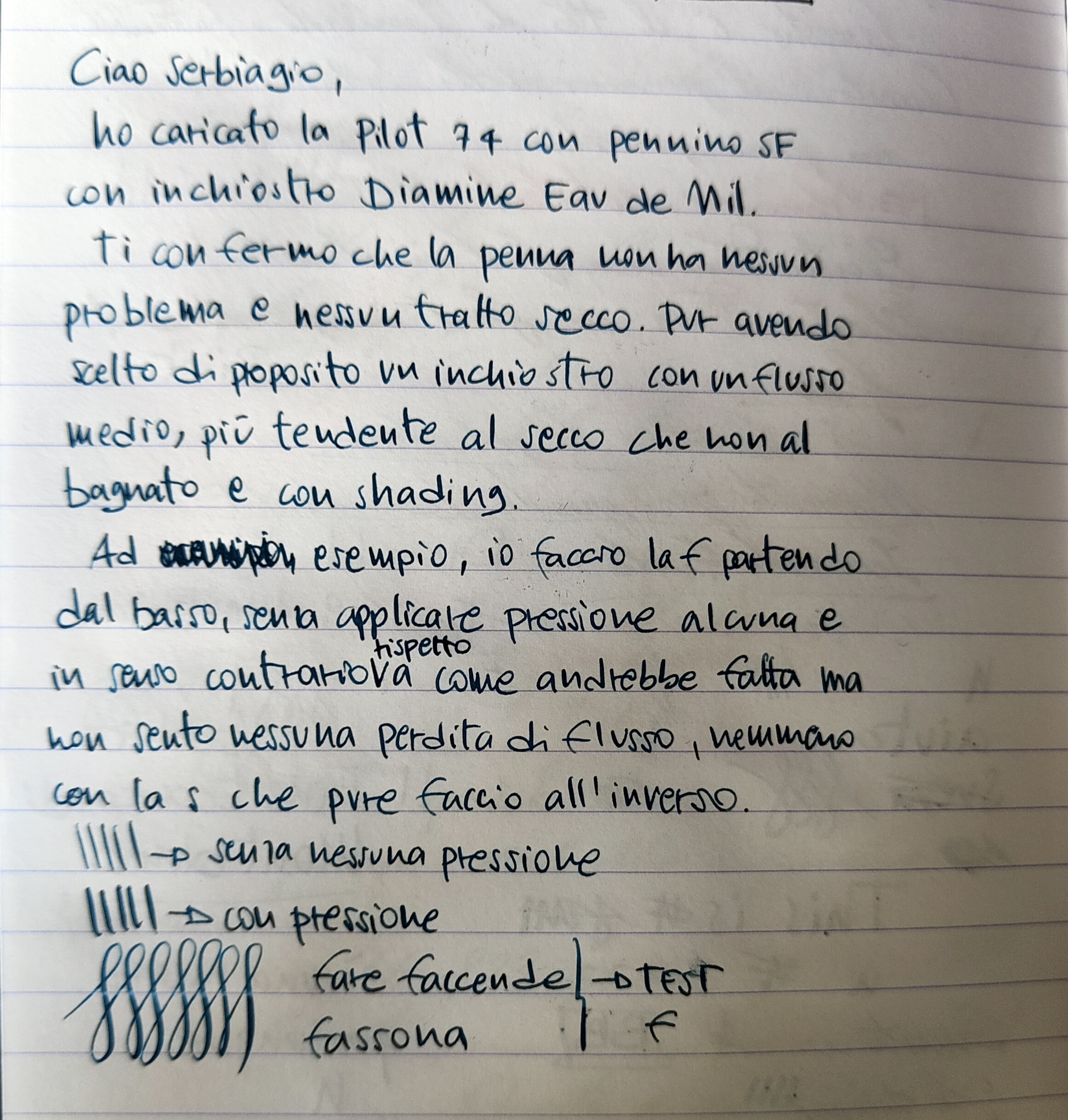 La mia 74 SF non ha il problema del tratto in salita, anzi scrive perfettamente sotto il suo peso. Non è bella e rilassante come l' FA della 823, ma siamo anche su altra fascia di prezzo. Io la 74 ce l'ho da un mese e mezzo e l' ho sempre usata solo con Iroshizuku Take- Sumi, se ti può essere utile posso caricarla con un Diamine Onyx Black o con un Royal Blue di Pelikan e ti dico come si comporta.Serbiagio ha scritto: ↑lunedì 28 ottobre 2024, 21:23 Vorrei provare la custom 91 con l 'sf, non ho velleità calligrafiche, ma spero che la definizione di Silvia "morbidoso" faccia intendere una scrittura più rilassata, come per degli appunti, che è ciò che sto cercando. basta che non sia troppo schizzinoso rispetto alla carta e non presenti il fastidioso asciugarsi del tratto in salita (problema che ho avuto con una custom 92 f). Se la risposta è ok ho già il dito pronto per "sparare" il colpo.