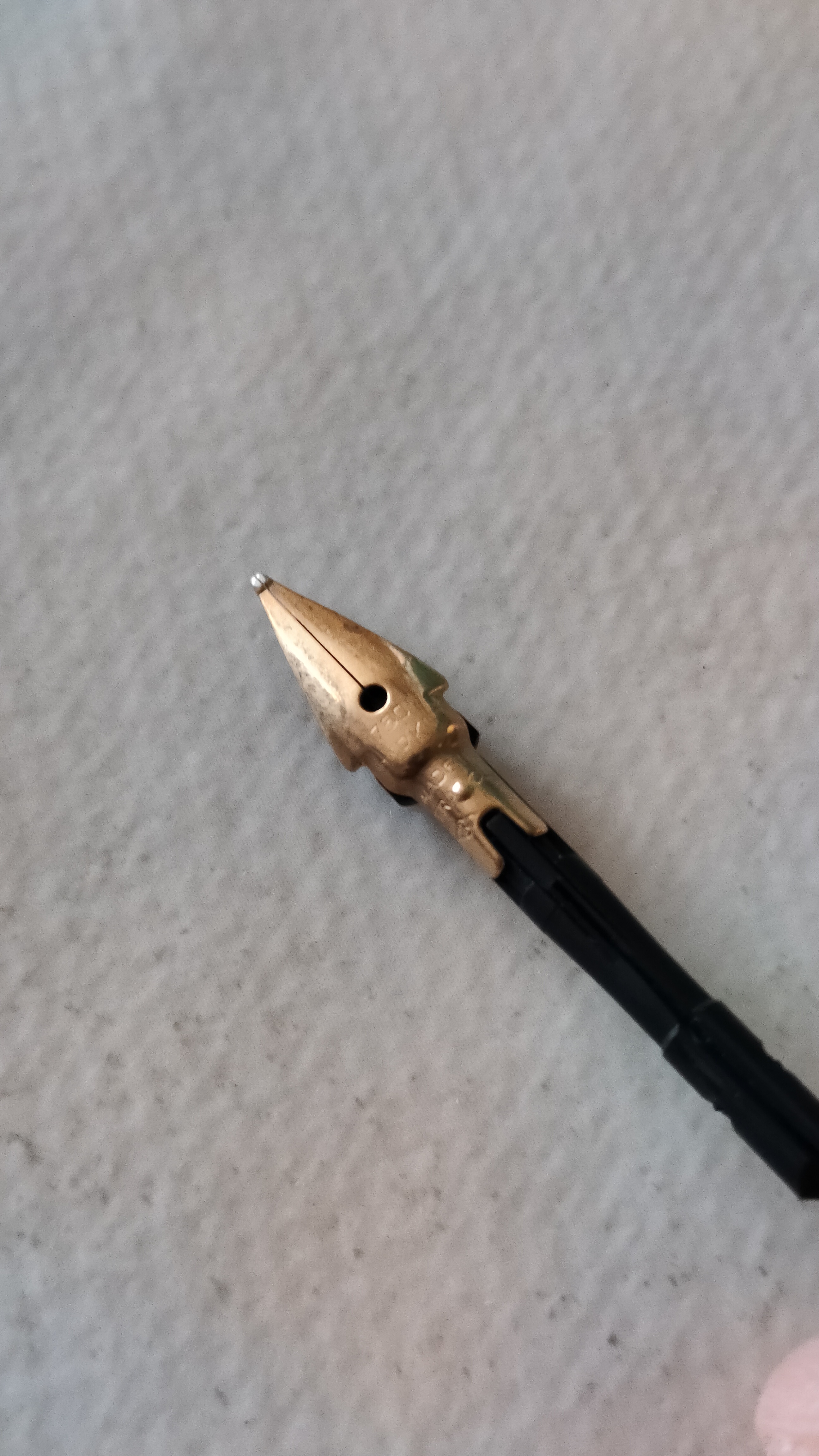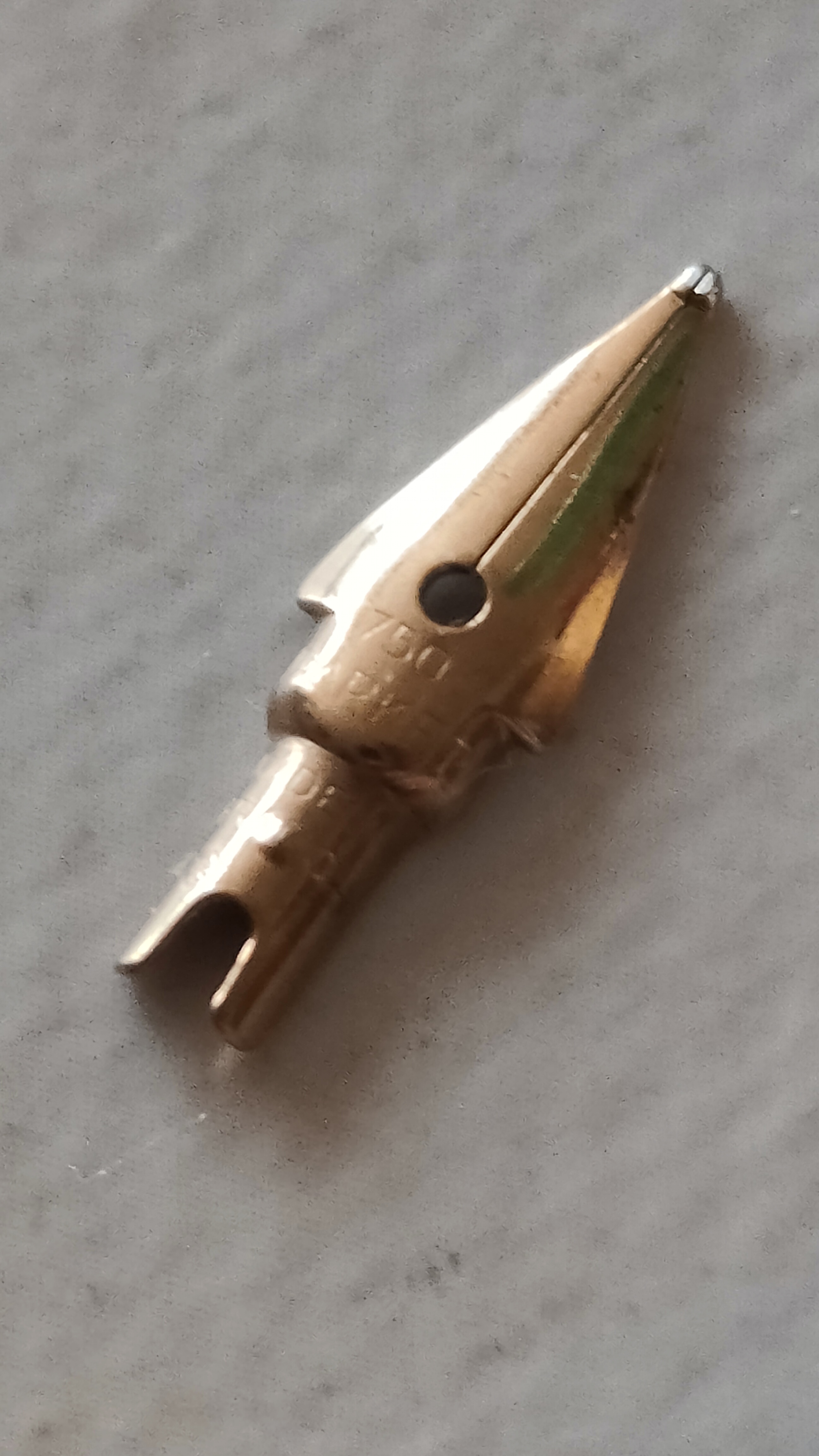 Comprata in un mercatino e pagata relativamente poco, volevo avere un informazione sul pennino di questo modello 45. Premetto che non é la prima volta che compro o ne vedo una, ho già in mio possesso altre due 45, una con corpo in plastica nera e cappuccio dorato e un'altra tutta in acciaio, del tutto simile a questa ma senza decorazioni in oro. Rispettivamente riportano la prima il pennino in oro 14kt e la seconda in acciaio. Premetto che ho inserito il punto interrogativo al titolo in quanto non so se a questo punto si tratta effettivamente di una 45, perché smontando la penna per ripulirla, mi accorgo che al pennino c'é impressa la punzonatura del rombo con le due "P" e la freccia di Parker (e fin qui, tutto ok), ma non c'é la scritta 14 kt, bensì la dicitura 750 M. (seguono foto)