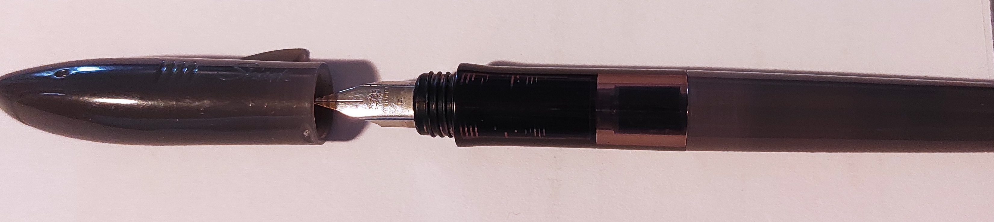 Pennino F in acciaio rigido ed abbastanza generoso come flusso di inchiostro, corpo in plastica e lunga quanto una bic, cappuccio a vite senza clip ma con la pinna... addirittura viene fornita di base con il converter plasticosissimo ma funzionale.