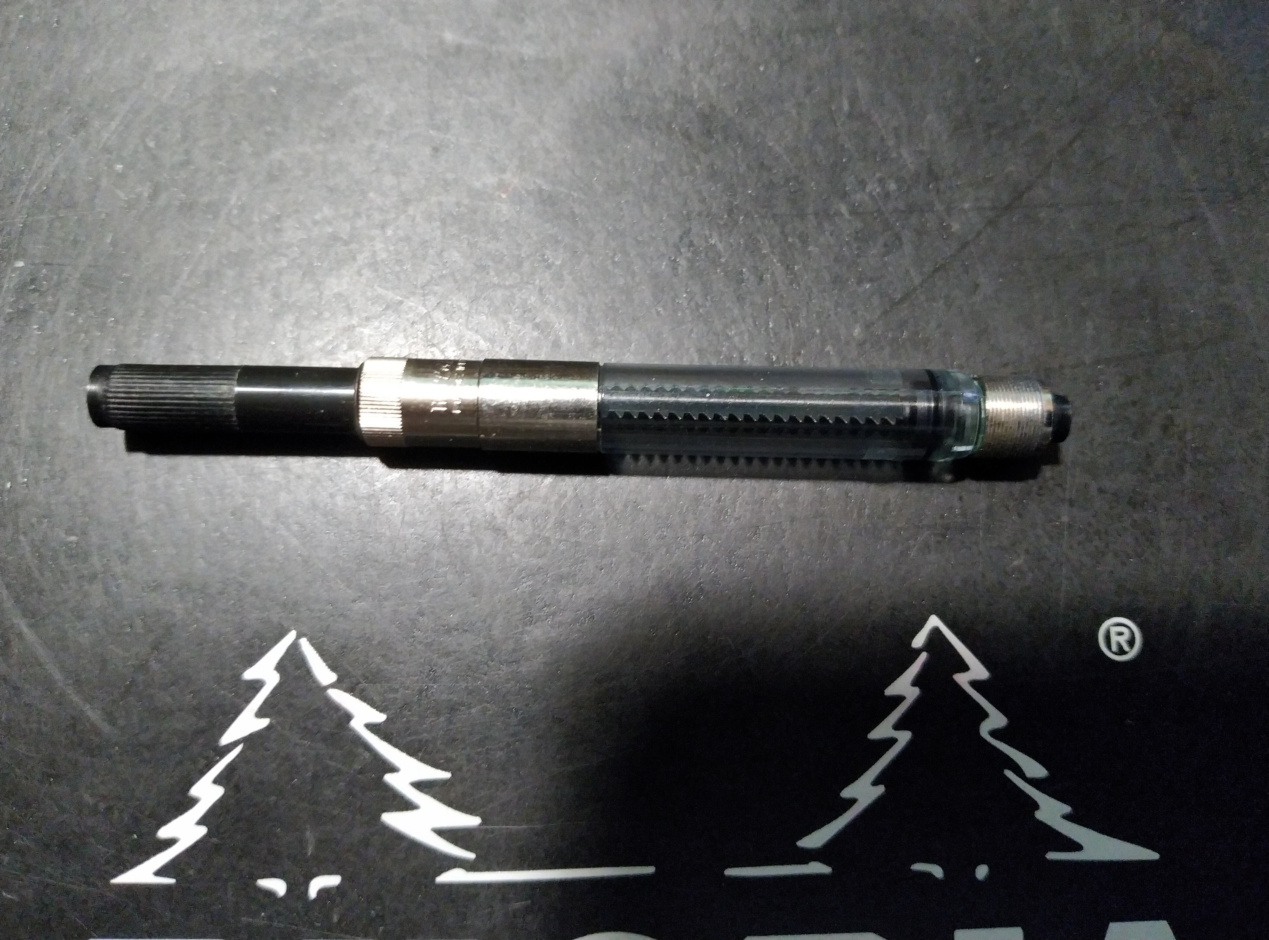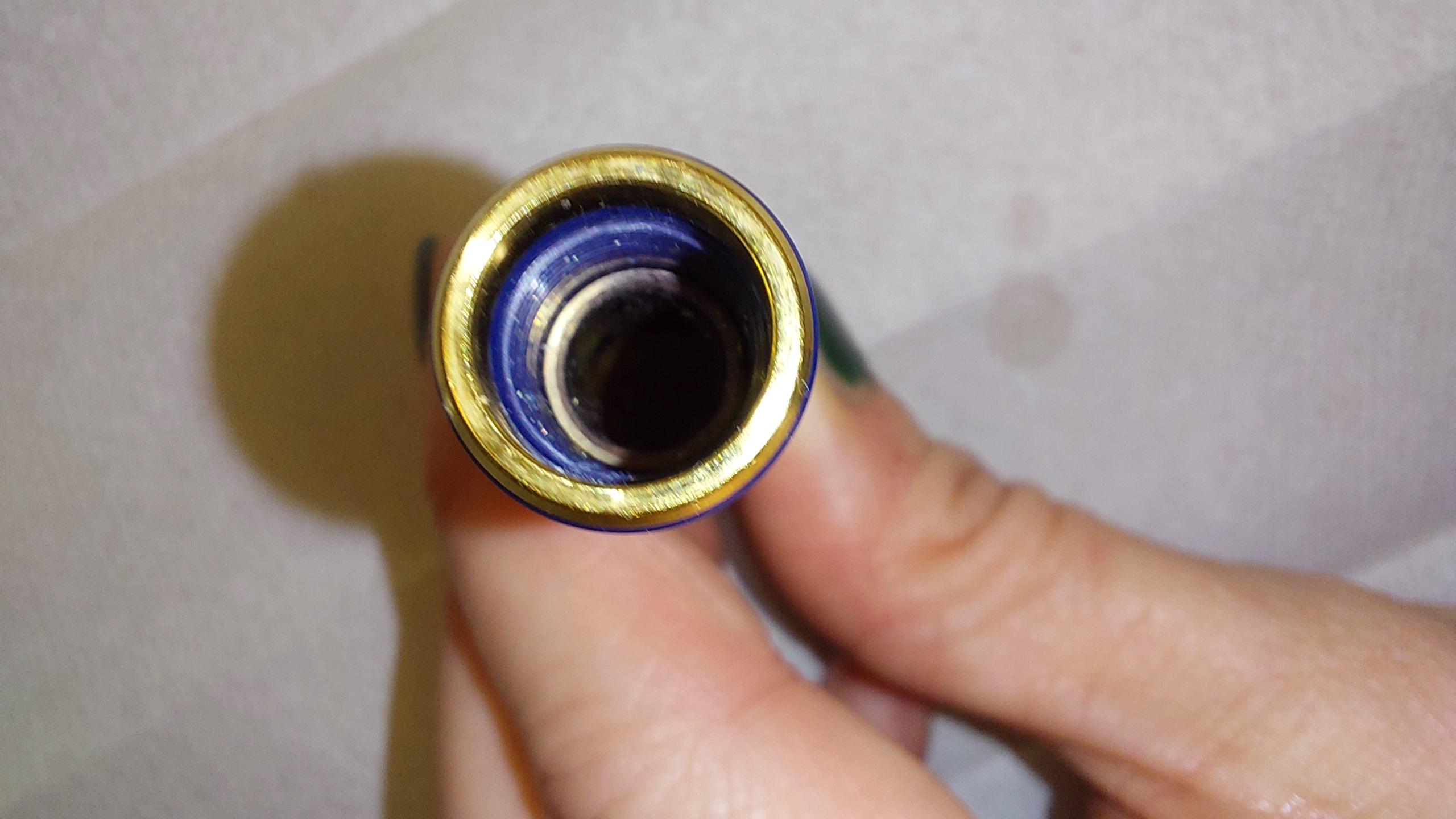 C'è un restringimento metallico poco sotto la filettatura, ed è talmente stretto che non ci passa nessun tipo di cartuccia in mio possesso (ne ho provate un po', anche con attacchi diversi dallo standard (Lamy, Parker, Online Kombi), giusto per capire cosa ci possa passare) e nemmeno i converter in mio possesso, che pure a un certo punto si restringono. L'unica che ci passa è la Parker lunga, ma è *troppo* lunga, quindi non riesco comunque ad avvitare il fusto alla sezione.