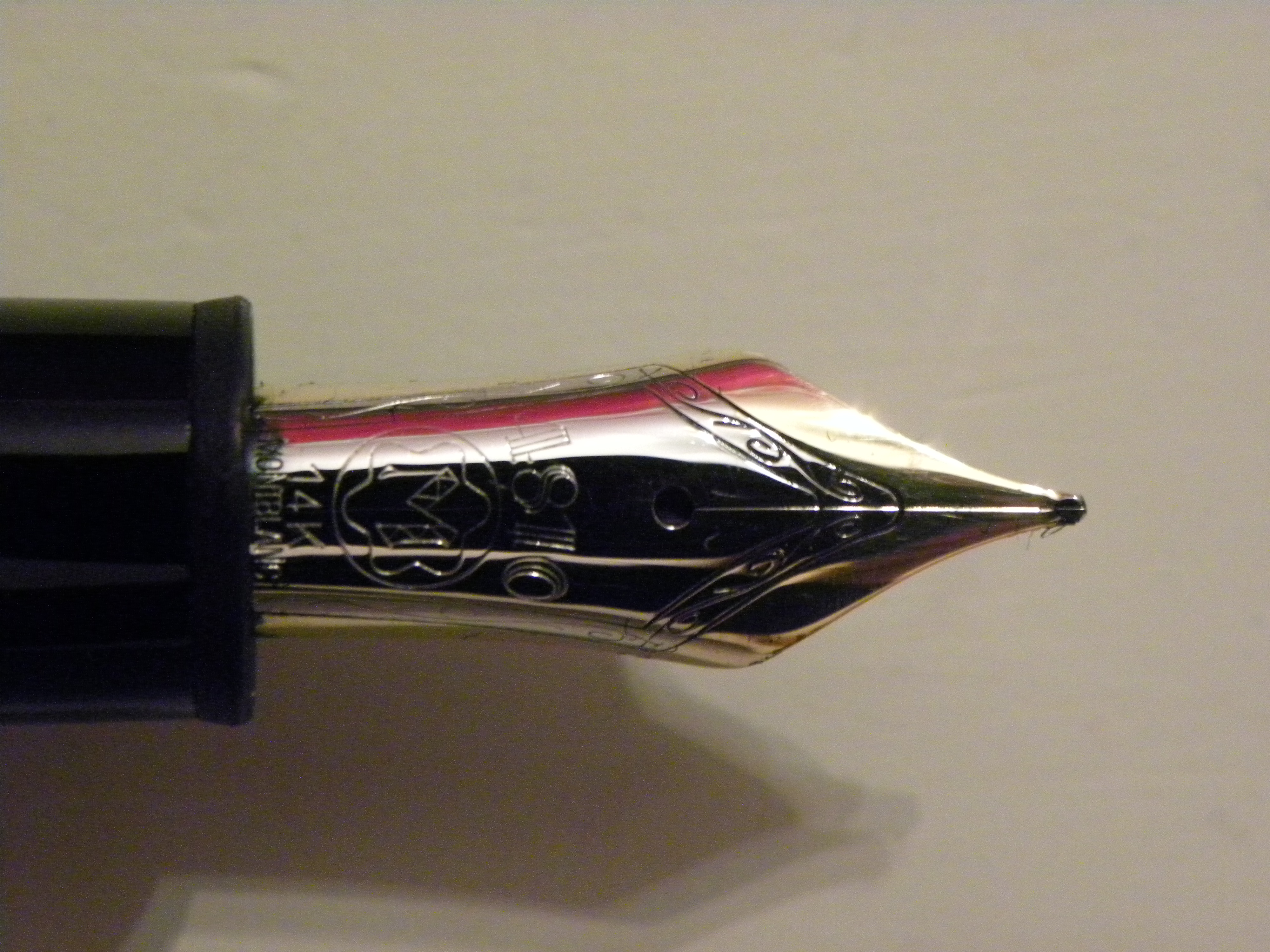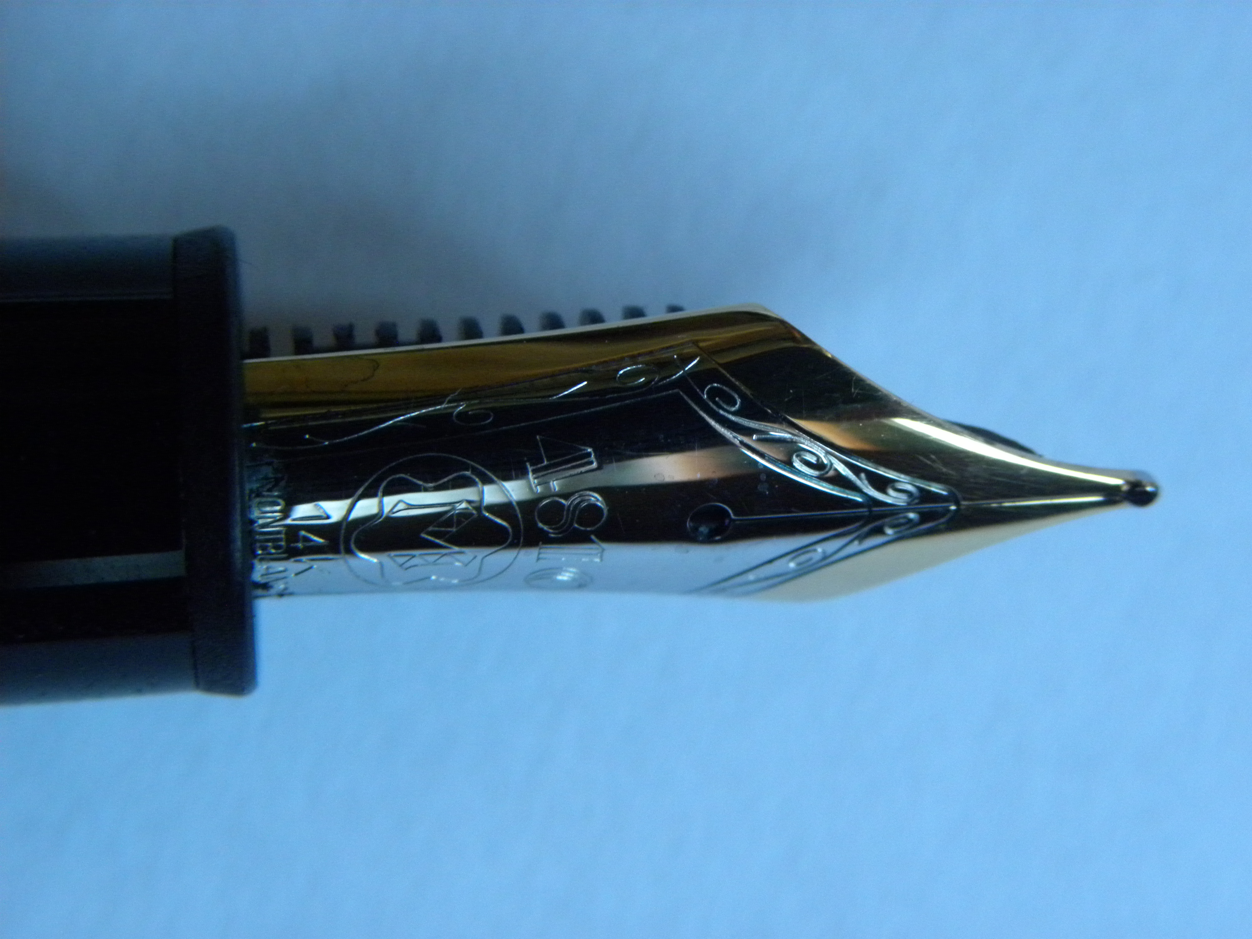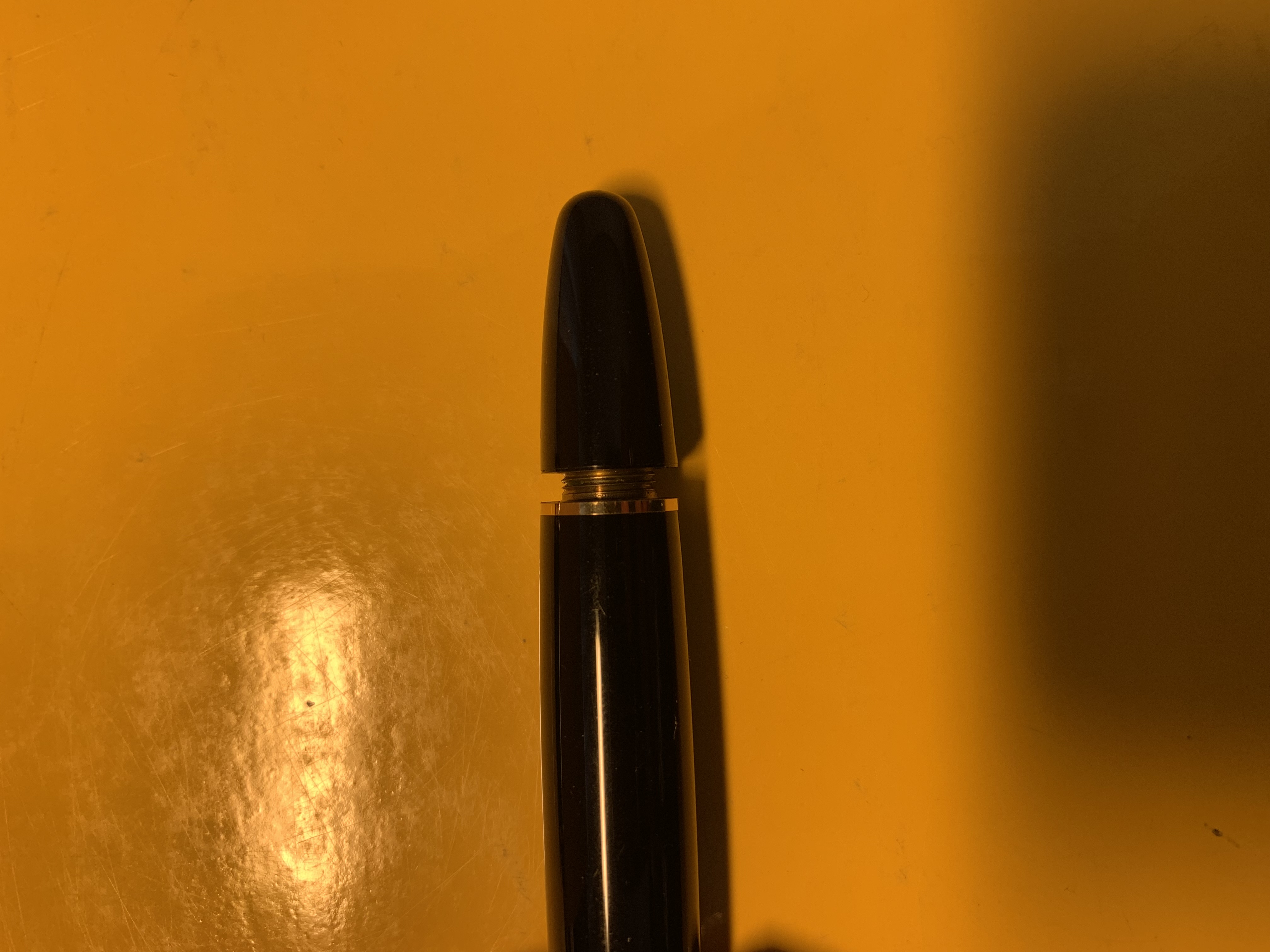 Salve ragazzi, la Montblanc 146 comprata su eBay a 190€, su cui ho fatto un post qualche giorno fa, mi è arrivata. Mi sembra tutto apposto, tranne per 2 cose: la stellina sul tappo mi sembra “troppo allineata” (ho sentito dire che non deve mai essere allineata con il fermaglio, ma mi potrei sbagliare) e il pistone, dopo i primi 2 giri, fino agli ultimi due è abbastanza duro (più di altre penne a pistone che possiedo, come Aurora 51 e Pelikan M400). È normale? Il peso è di 30 grammi con tappo, 19 g se rimosso. Il pennino non è magnetico. Ho fatto il test della luce nel tappo e allego foto. (Dal vivo il colore è un po’ più acceso). L’ho caricata e si carica regolarmente, se non appunto per il pistone leggermente duro, ma che sembrerebbe essersi “ammorbidito” con qualche carico e scarico. Credete, viste ora queste ulteriori foto, che debba farla controllare da un negozio di stilografiche qui in città o non serve? Grazie in anticipo.