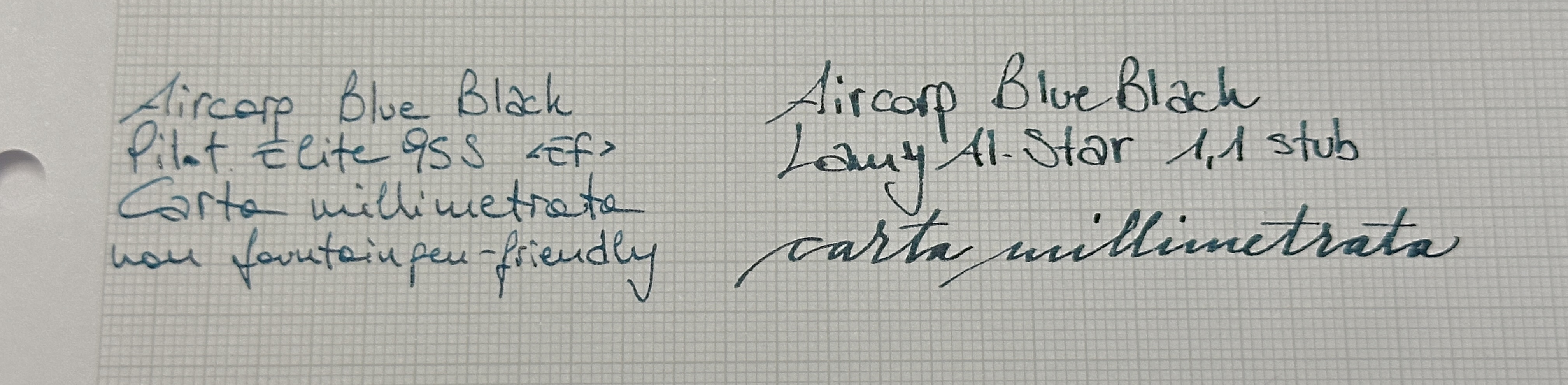 Qui vedi bene la differenza tra un flusso abbondante che, nonostante il pennino largo che spalma di più il pigmento, restituisce un inchiostro scuro e l’extra fine con il flusso contenuto tipico giapponese su cui il blu black sembra quasi azzurro