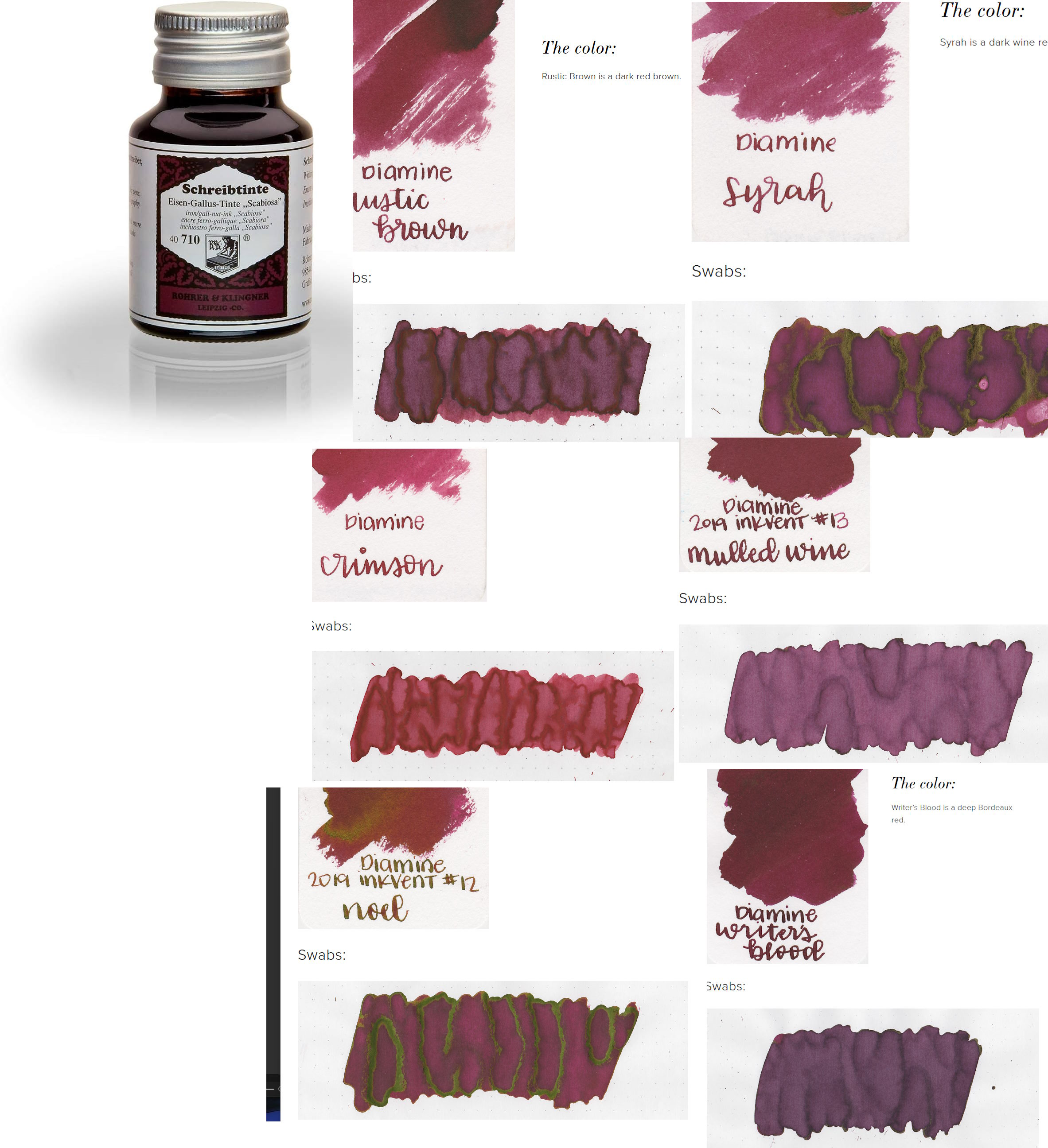 Sicuramente Antonius dovrà scegliere a quali tonalità di colore dare la priorità. Di inchiostri che restano luminosi dopo essersi asciugati ne conosco pochissimi e l’Oxblood certamente non è fra questi. I due F.Schimpf citati restano ben incisi su carta. Altro inchiostro sulle tonalità sangue con una piccola percentuale di rosso in più rispetto all’Oxb. è il Noel sempre di Diamine, nella gamma Ink Vent.
