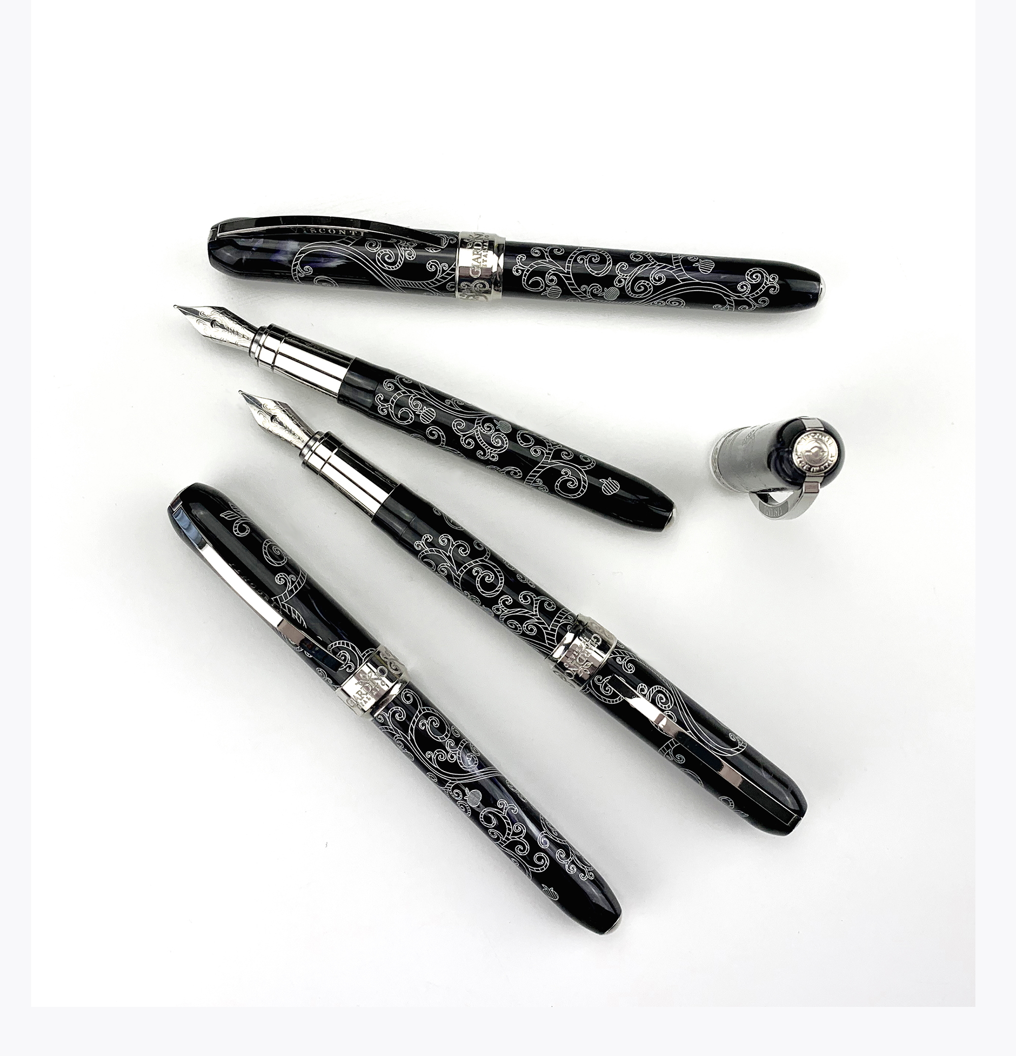 La decorazione è stata realizzata con la tecnica Scrimshaw, che credo solo Visconti facesse sulle penne, almeno fino a una decina di anni fa.
