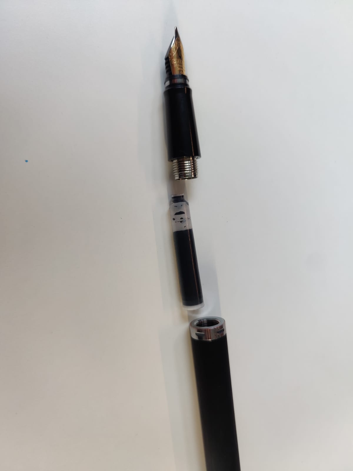 Grazie per i consigli con la sferetta che infatti si trova all'interno della cartuccia, basta dare una leggera scossa alla penna e cade giù la sferetta. Uso la Pelikan 4001 nera in cartuccia, delle varie Diamine Shimmering in converter e in più la Pilot Tsuwairo Nera (attualmente però non la uso).