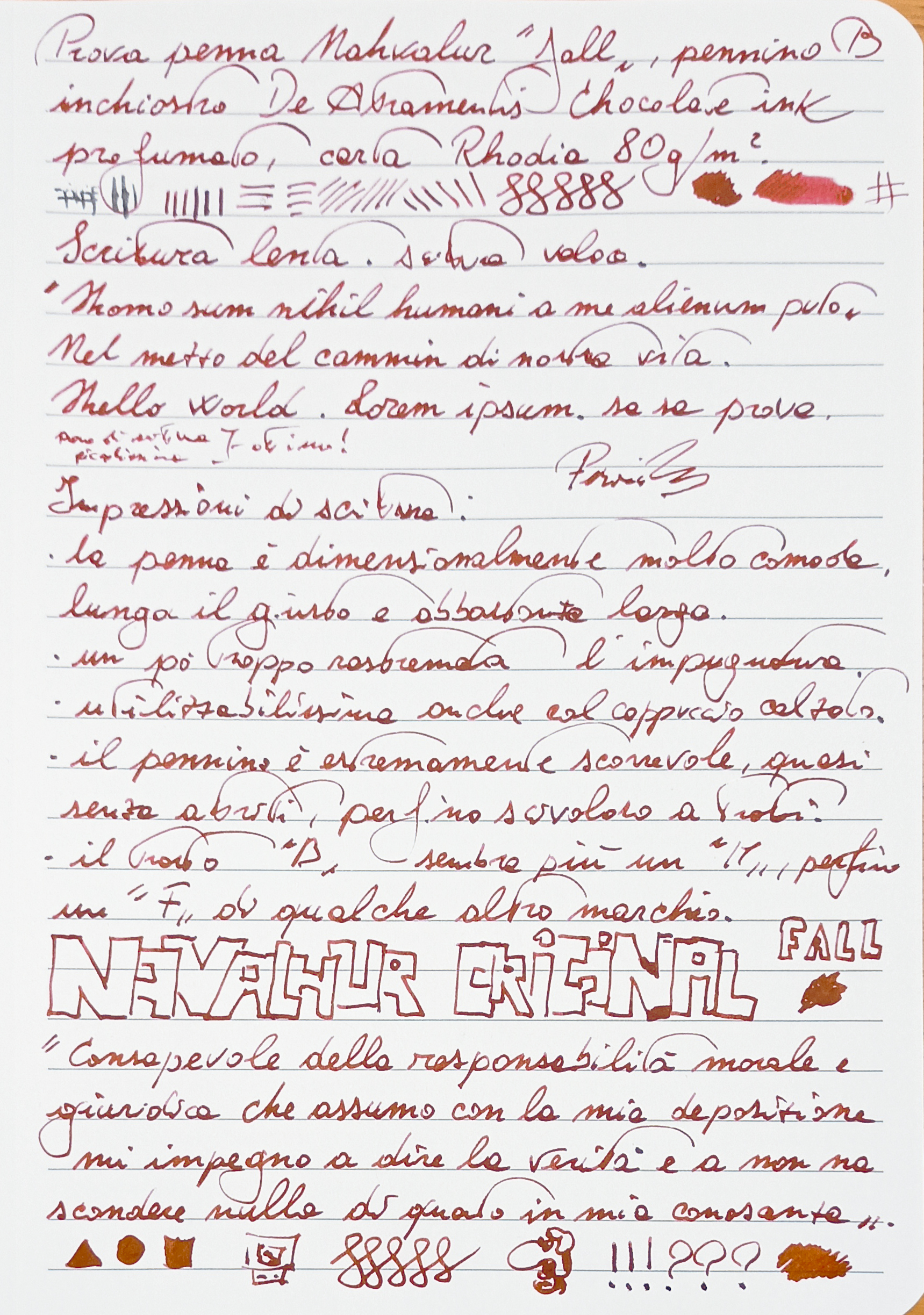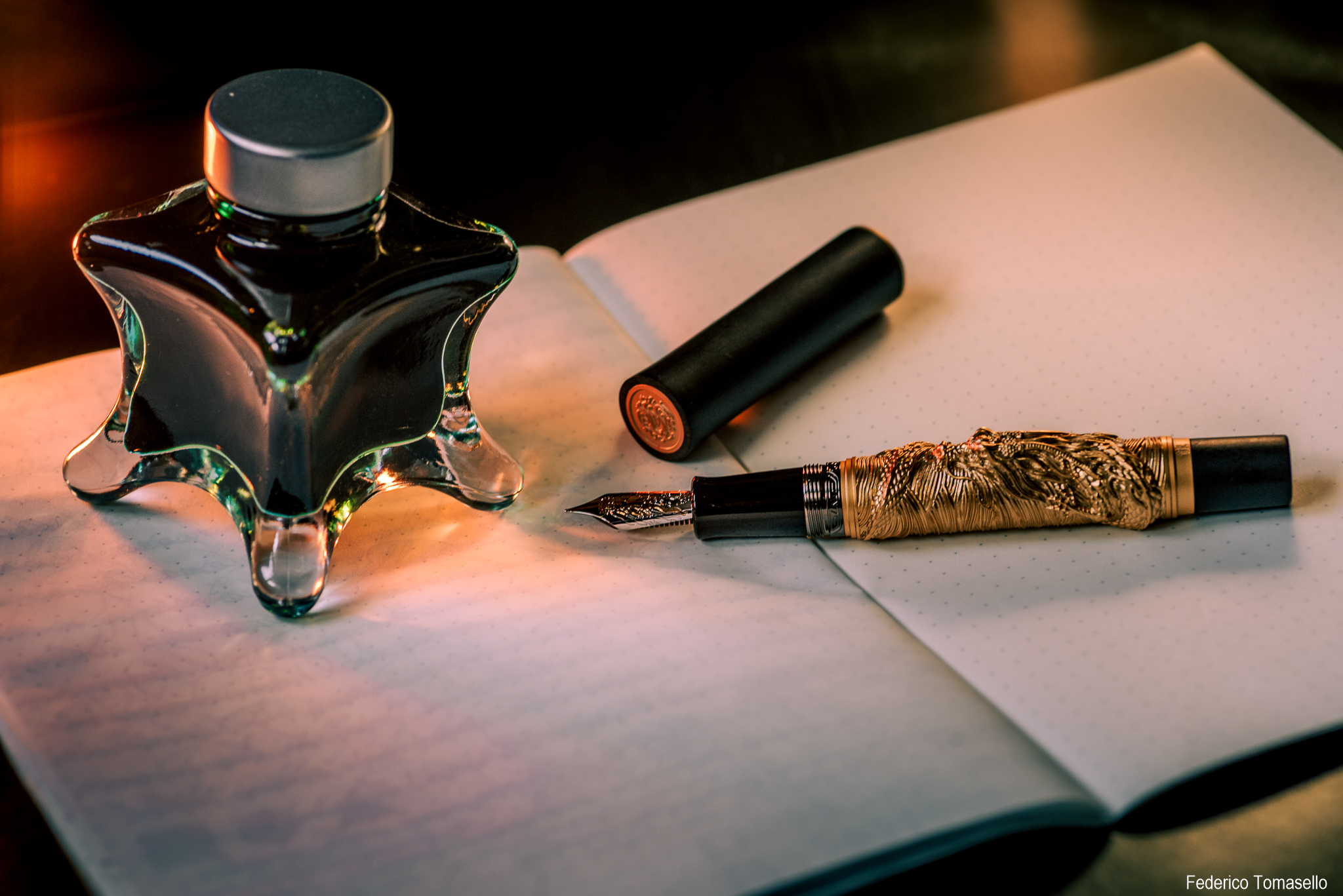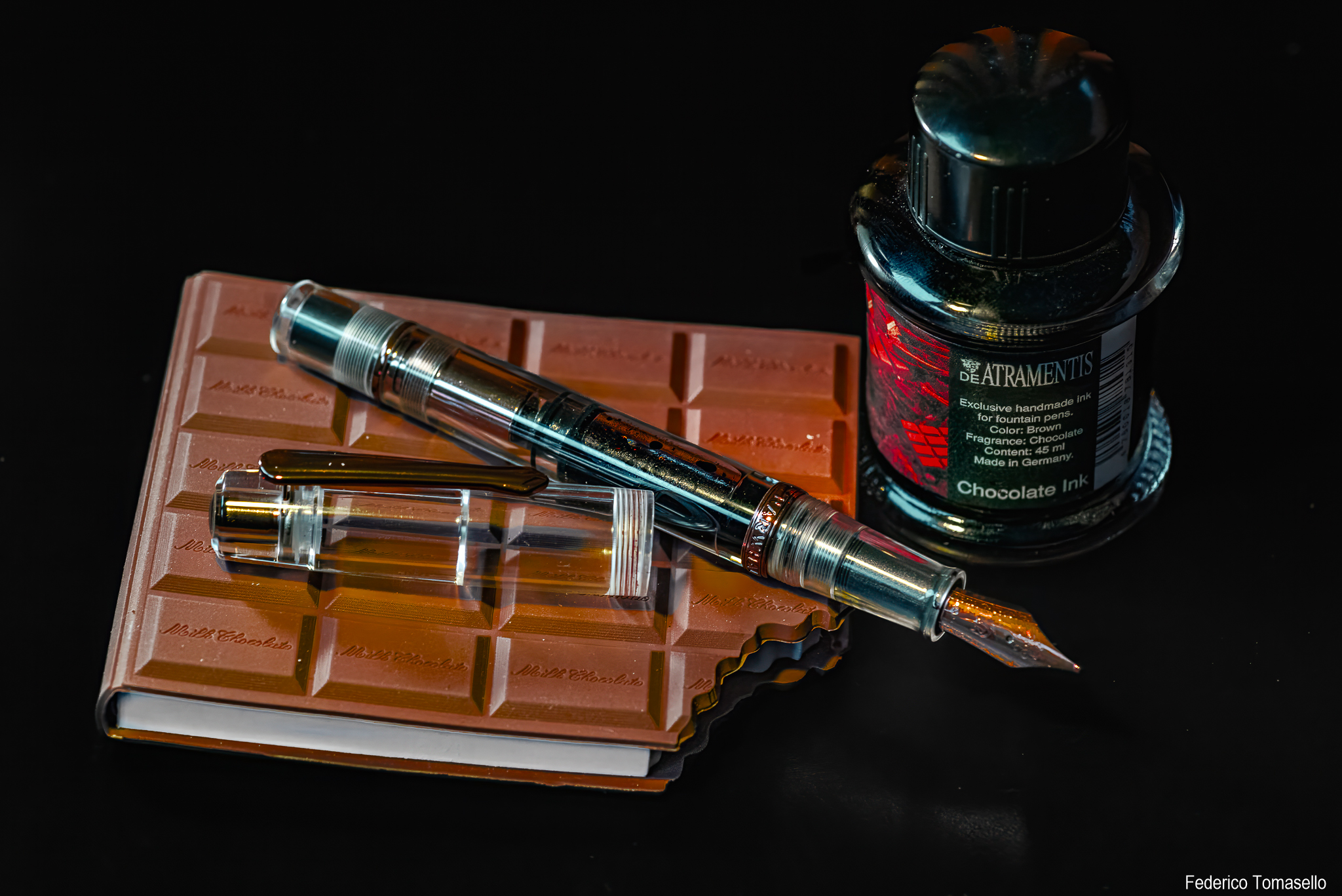 Mi ero innamorato dei colori della metalleria di questa penna appena ne ho scoperto l'esistenza e quindi, durante le offerte del Black Friday, ho deciso di acquistarla. Tanto mi aveva entusiasmato esteticamente che ho deciso di comprarle anche un inchiostro dedicato (il De Atramentis Chocolate profumato) e perfino un taccuino tutto suo, che potete notare in foto.