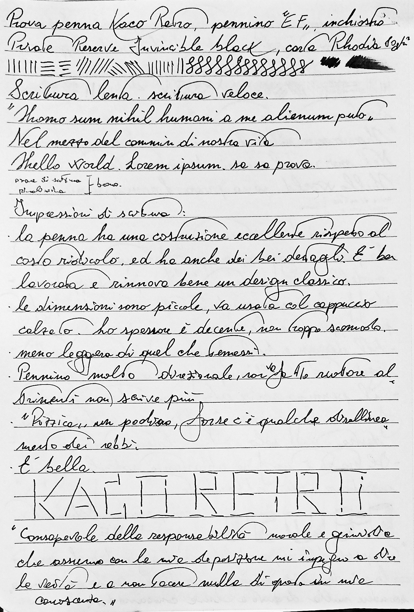 Sul piano della scrittura invece non l'ho trovata particolarmente performante: il pennino, nonostante il tratto ampio, era un po' spigoloso e scriveva come se avesse una sorta di "trama". La cosa si è sistemata con una lucidata velocissima, ma è rimasto il fatto che il flusso di inchiostro è scarso, la penna rimane un po' in apnea dopo qualche rigo. Continua a scrivere, ma il B pieno delle prime righe diventa più un M abbondante.