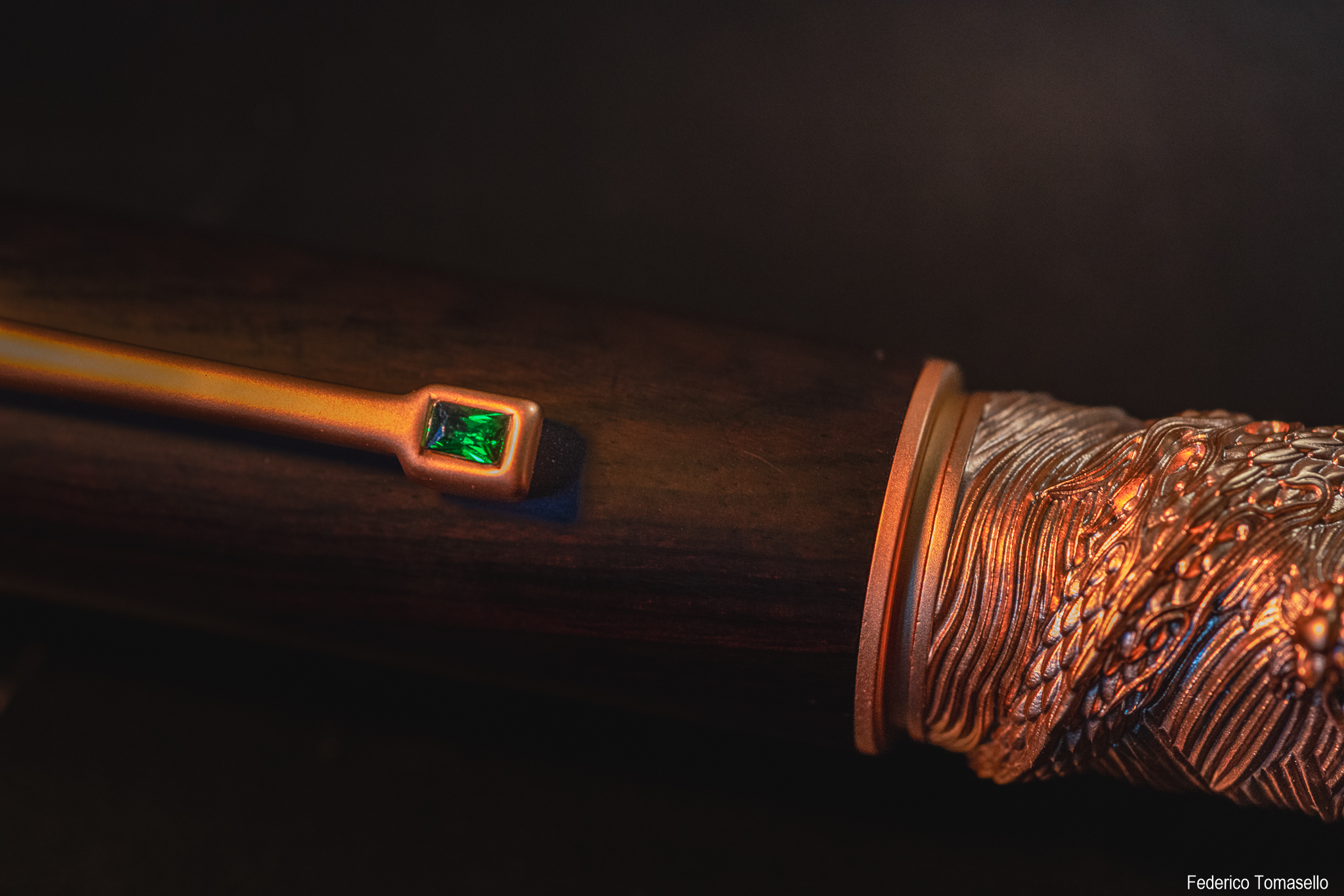 La modellazione del dragone sul fusto è ottimamente studiata, non dà alcun fastidio alle dita e nonostante la diversità di materiali (legno, plastica, metallo) la penna è perfettamente bilanciata e "scompare" in mano.