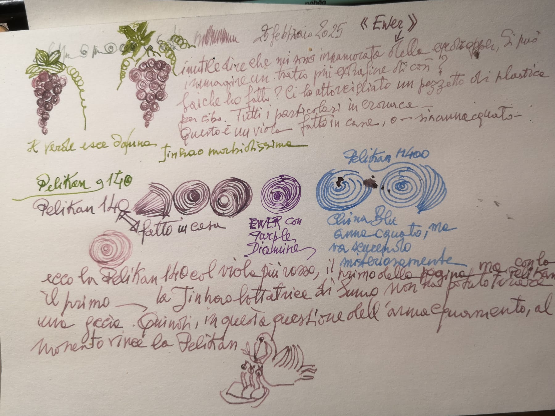 se ne deduce, se si la pazienza, che non tutte le penne sopportano l'inchiostro annacquato, a prescindere dalla glicerina, che è stata messa in abbondanza.ma in questo caso, vanno bene le pelikan a stantuffo, spaziosec ed emme. le cinesi diventano durissime, sempre che si carichino. Alcune rifiutano anche di caricarsi. le eyedropper e rientranti sono allo studio. questo è quanto so raccontare al momento, se qualcuno fosse interessato. a presto! :crazy: