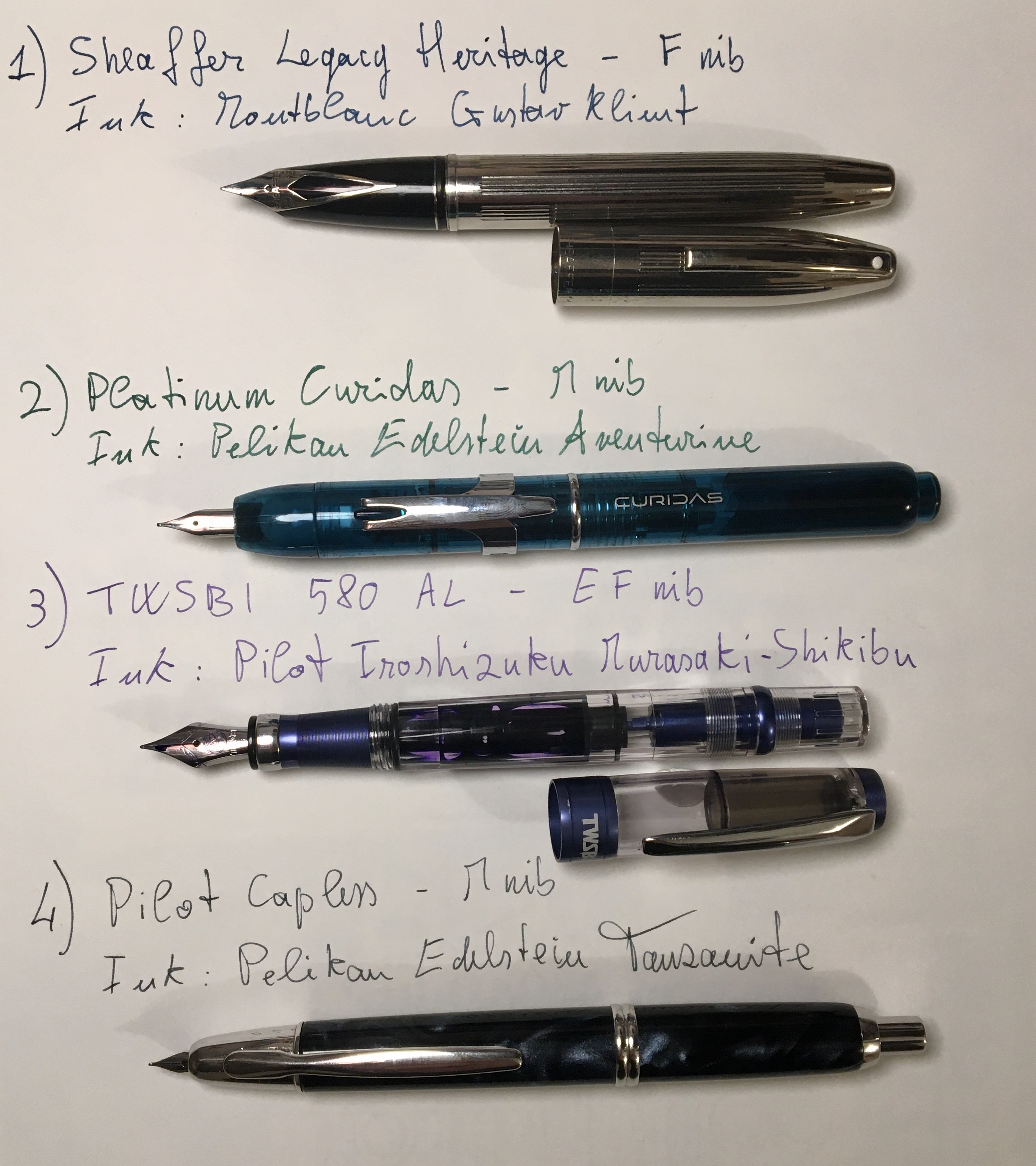 Ed ecco in foto le quattro inchiostrate in questo periodo: tutte acquisti recenti, anche se la Sheaffer era una rimanenza di magazzino, comprata d’impulso per via del pennino, che io trovo irresistibilmente attraente, e made in USA.