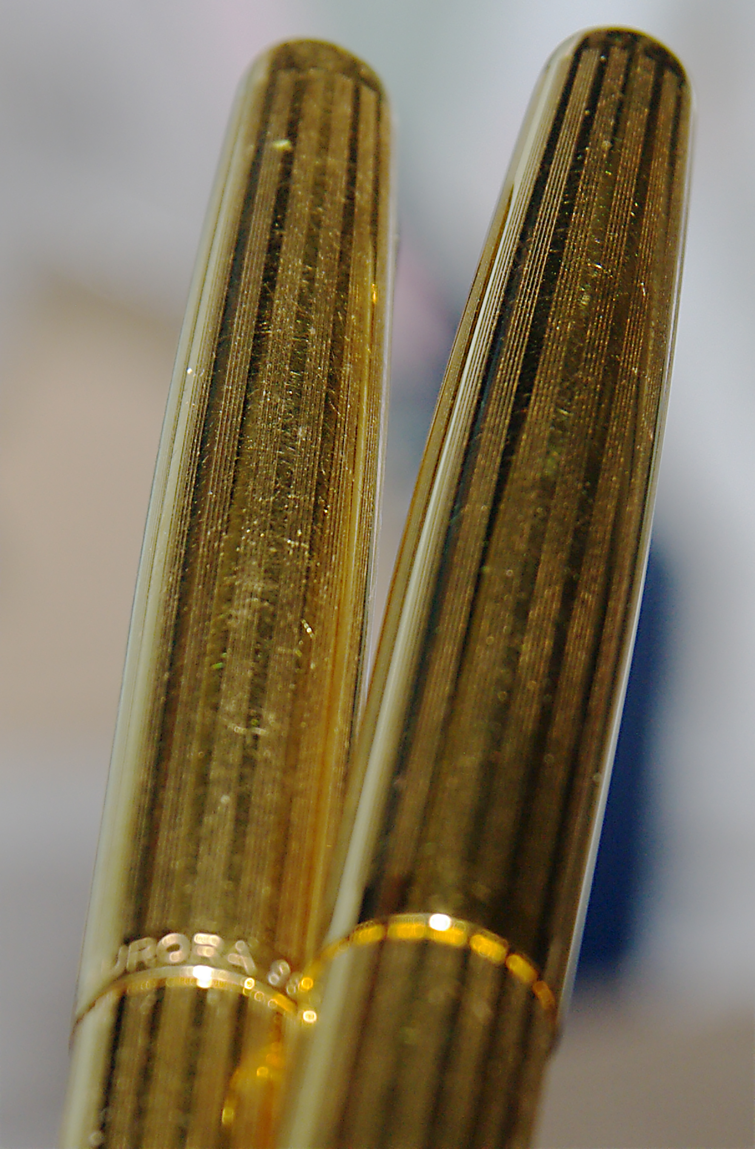 Per la satinata non ho idea dell'epoca di produzione, la millerighe invece mi è stata regalata nel 1980, nella classica scatola blu con penna biro. Ho anche idea che fosse rimasta in negozio per un po', perché ricordo che il foglietto era già un po' ingiallito sui bordi.